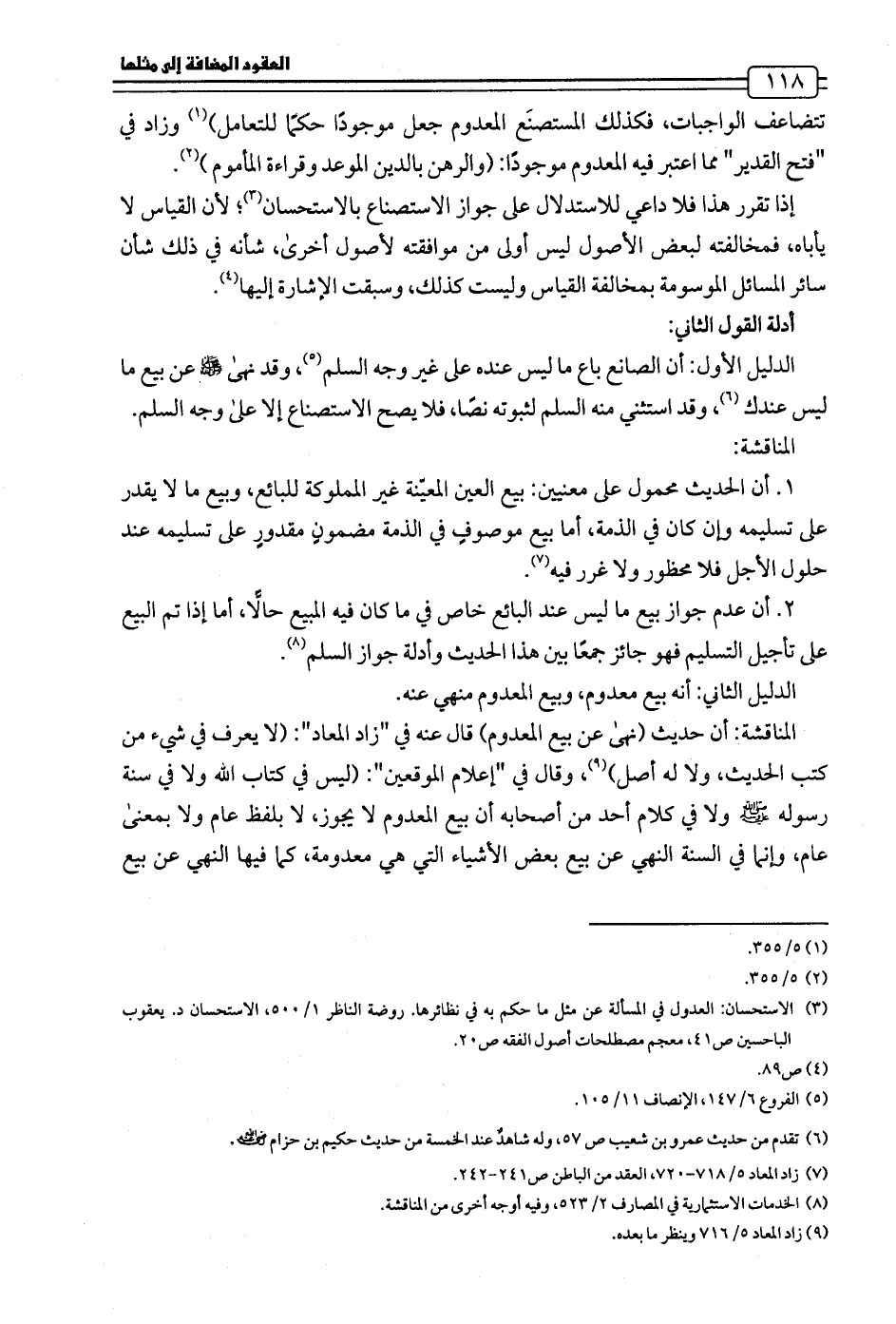 المناقشة: أن حديث (نهى عن بيع المعدوم) قال عنه في "زاد المعاد": (لا يعرف في شيء من كتب الحديث، ولا له أصل) (¬9)، وقال في "إعلام الموقعين": (ليس في كتاب الله ولا في سنة رسوله - صلى الله عليه وسلم - ولا في كلام أحد من أصحابه أن بيع المعدوم لا يجوز، لا بلفظ عام ولا بمعنى عام، وإنما في السنة النهي عن بيع بعض الأشياء التي هي معدومة، كما فيها النهي عن بيع