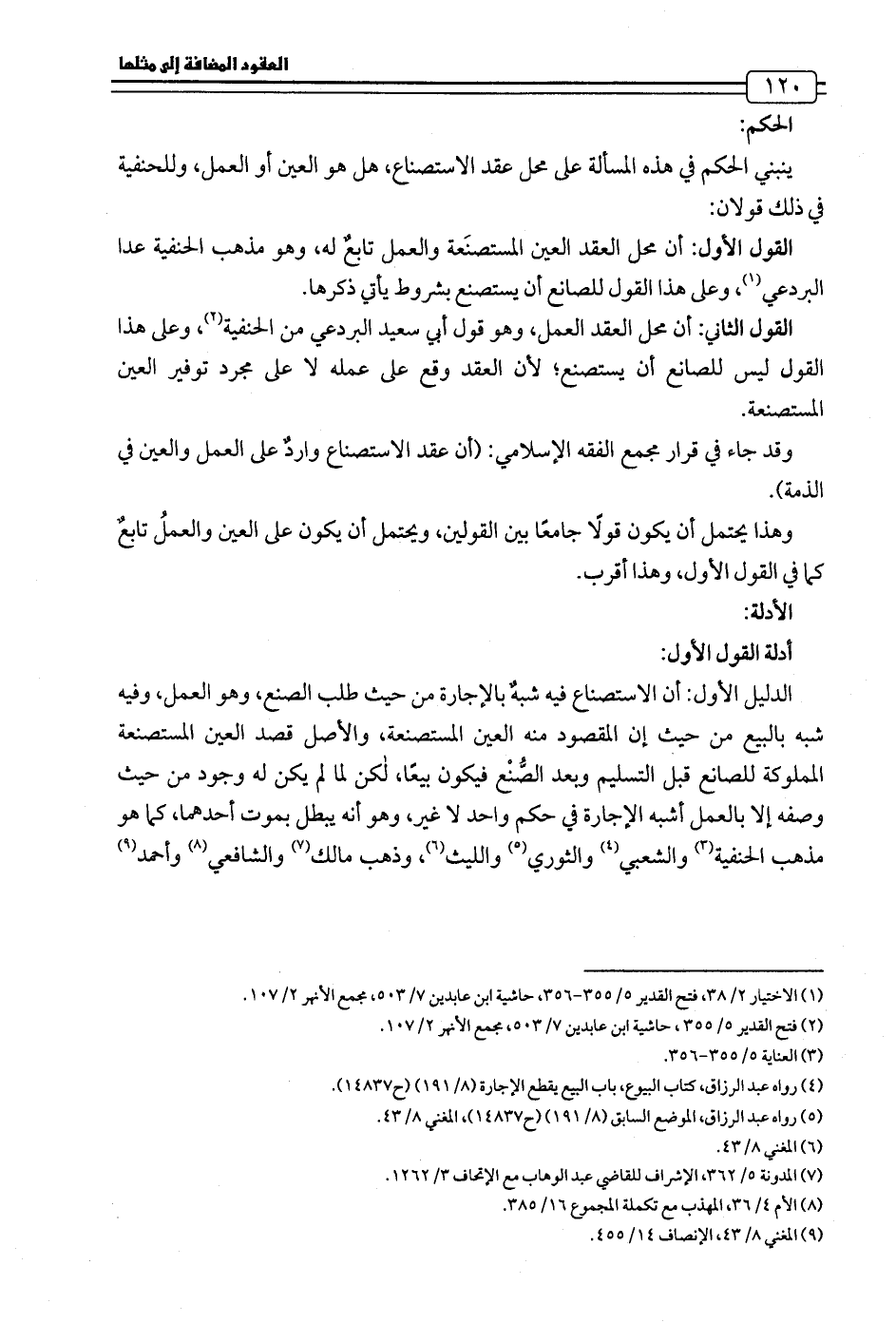 القول الأول: أن محل العقد العين المستصنَعة والعمل تابعٌ له، وهو مذهب الحنفية عدا البردعي (¬1)، وعلى هذا القول للصانع أن يستصنع بشروط يأتي ذكرها.
