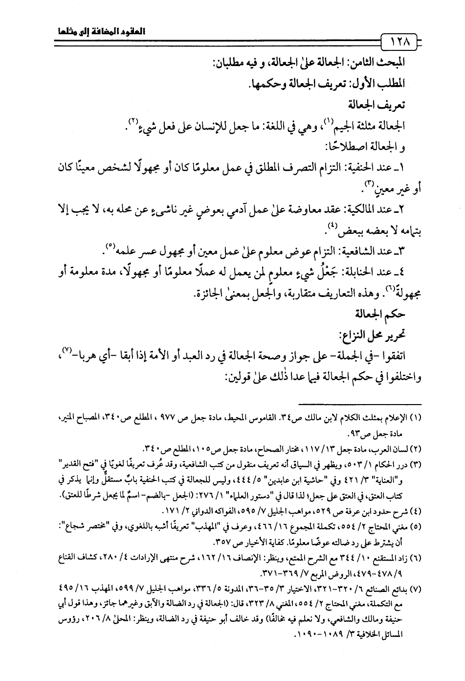 (¬3) درر الحكام 1/ 503، ويظهر في السياق أنه تعريف منقول من كتب الشافعية، وقد عُرف تعريفًا لغويًا في "فتح القدير" و"العناية" 3/ 421 وفي "حاشية ابن عابدين" 5/ 444، وليس للجعالة في كتب الحنفية بابٌ مستقلٌّ وإنما يذكر في كتاب العتق، في العتق على جعل؛ لذا قال في "دستور العلماء" 1/ 276: (الجعل -بالضم- اسمٌ لما يجعل شرطًا للعتق).