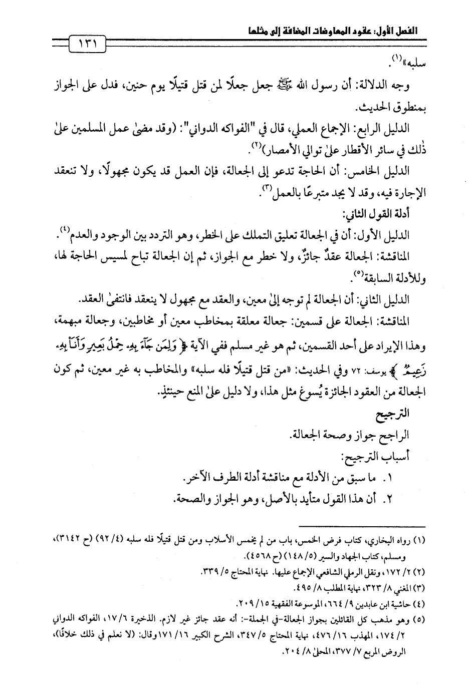 (¬5) وهو مذهب كل القائلين بجواز الجعالة-في الجملة-: أنه عقد جائز غير لازم. الذخيرة 6/ 17، الفواكه الدواني 2/ 174، المهذب 16/ 476، نهاية المحتاج 5/ 347، الشرح الكبير 16/ 171 وقال: (لا نعلم في ذلك خلافًا)، الروض المربع 7/ 377، المحلى 8/ 204.