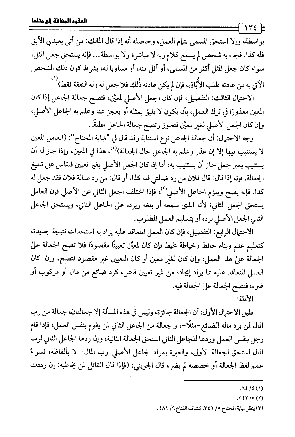 وجه الاحتمال: أن جعالة الجاعل نوع استنابة وقد قال في "نهاية المحتاج": (العامل المعين لا يستنيب فيها إلا إن عذر وعلم به الجاعل حال الجعالة) (¬2)، هذا في المعين، وإذا جاز له أن يستنيب بغير جعل جاز أن يستنيب به، أما إذا كان الجعل الأصلي بغير تعيين فيقاس على تبليغ الجعالة، فإنه إذا قال: قال فلان من رد ضالتي فله كذا، أو قال: من رد ضالة فلان فقد جعل له كذا. فإنه يصح ويلزم الجاعل الأصلي (¬3)، فإذا اختلف الجعل الثاني عن الأصلي فإن العامل يستحق الجعل الثاني؛ لأنه الذي سمعه أو بلغه ويرده على الجاعل الثاني، ويستحق الجاعل الثاني الجعل الأصلي برده أو بتسليم العمل المطلوب.