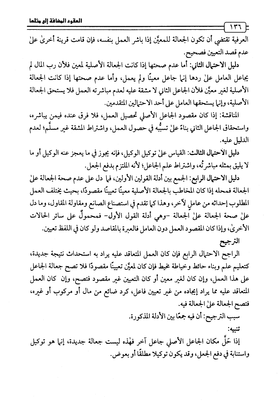 الراجح الاحتمال الرابع فإن كان العمل المتعاقد عليه يراد به استحداث نتيجة جديدة، كتعليم علم وبناء حائط وخياطة مخيط فإن كان لمعيَّن تعيينًا مقصودًا فلا تصح جعالة الجاعل على هذا العمل، وإن كان لغير معين أو كان التعيين غير مقصود فتصح، وإن كان العمل المتعاقد عليه مما يراد إيجاده من غير تعيين فاعل، كرد ضائع من مال أو مركوب أو غيره، فتصح الجعالة على الجعالة فيه.