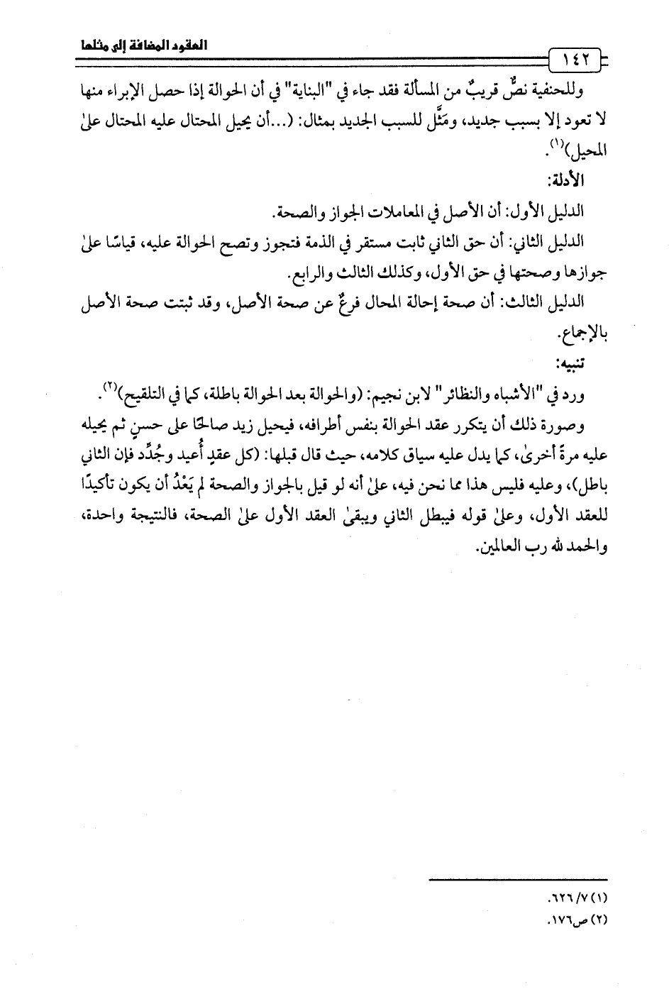 وصورة ذلك أن يتكرر عقد الحوالة بنفس أطرافه، فيحيل زيد صالحًا على حسنٍ ثم يحيله عليه مرةً أخرى، كما يدل عليه سياق كلامه، حيث قال قبلها: (كل عقدٍ أُعيد وجُدِّد فإن الثاني باطل)، وعليه فليس هذا مما نحن فيه، على أنه لو قيل بالجواز والصحة لم يَعْدُ أن يكون تأكيدًا للعقد الأول، وعلى قوله فيبطل الثاني ويبقى العقد الأول على الصحة، فالنتيجة واحدة، والحمد لله رب العالمين.
