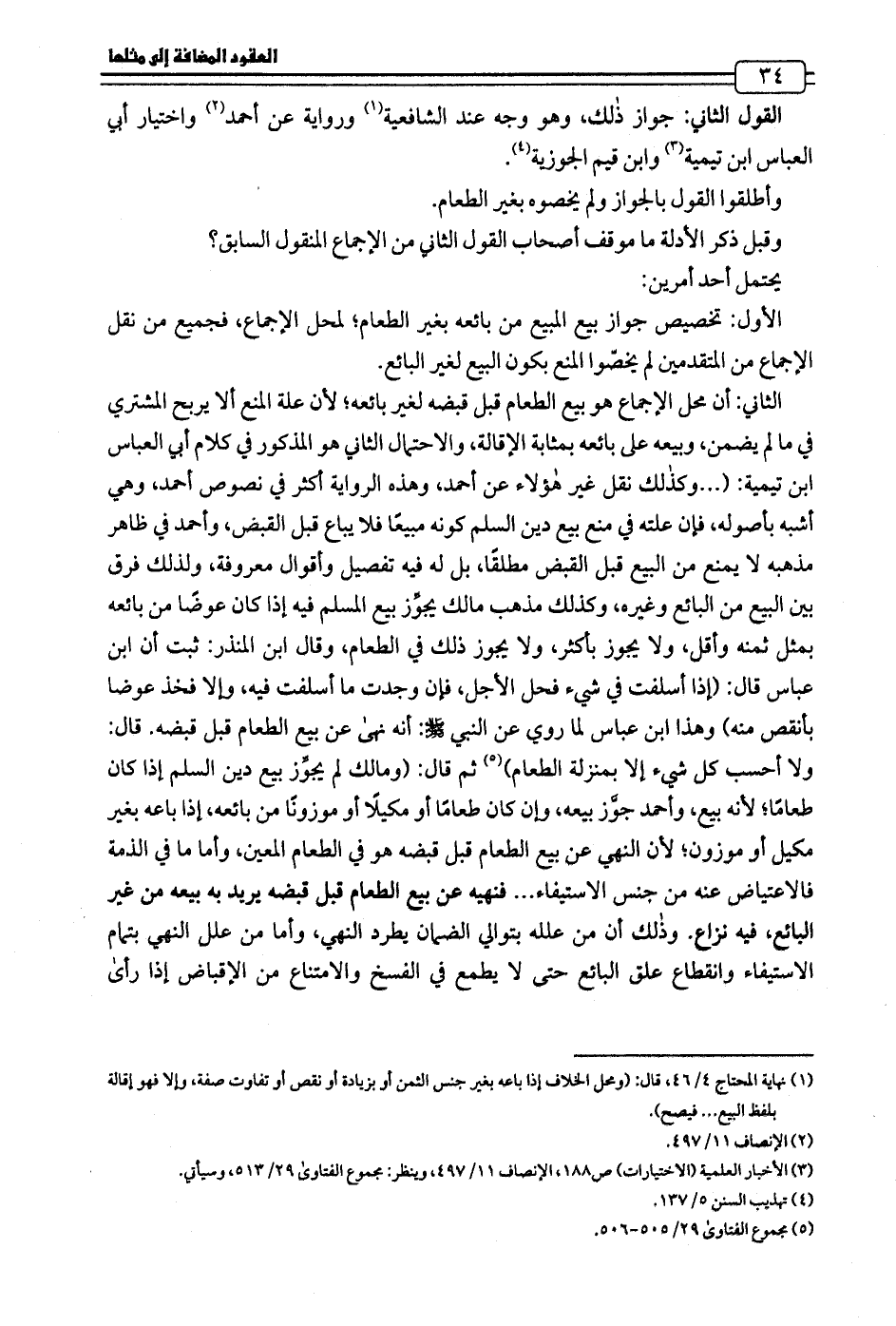 الثاني: أن محل الإجماع هو بيع الطعام قبل قبضه لغير بائعه؛ لأن علة المنع ألا يربح المشتري في ما لم يضمن، وبيعه على بائعه بمثابة الإقالة، والاحتمال الثاني هو المذكور في كلام أبي العباس ابن تيمية: (... وكذلك نقل غير هؤلاء عن أحمد، وهذه الرواية أكثر في نصوص أحمد، وهي أشبه بأصوله، فإن علته في منع بيع دين السلم كونه مبيعًا فلا يباع قبل القبض، وأحمد في ظاهر مذهبه لا يمنع من البيع قبل القبض مطلقًا، بل له فيه تفصيل وأقوال معروفة، ولذلك فرق بين البيع من البائع وغيره، وكذلك مذهب مالك يجوِّز بيع المسلم فيه إذا كان عوضًا من بائعه بمثل ثمنه وأقل، ولا يجوز بأكثر، ولا يجوز ذلك في الطعام، وقال ابن المنذر: ثبت أن ابن عباس قال: (إذا أسلفت في شيء فحل الأجل، فإن وجدت ما أسلفت فيه، وإلا فخذ عوضا بأنقص منه) وهذا ابن عباس لما روي عن النبي - صلى الله عليه وسلم -: أنه نهى عن بيع الطعام قبل قبضه. قال: ولا أحسب كل شيء إلا بمنزلة الطعام) (¬5) ثم قال: (ومالك لم يجوِّز بيع دين السلم إذا كان طعامًا؛ لأنه بيع، وأحمد جوَّز بيعه، وإن كان طعامًا أو مكيلًا أو موزونًا من بائعه، إذا باعه بغير مكيل أو موزون؛ لأن النهي عن بيع الطعام قبل قبضه هو في الطعام المعين، وأما ما في الذمة فالاعتياض عنه من جنس الاستيفاء ... فنهيه عن بيع الطعام قبل قبضه يريد به بيعه من غير البائع، فيه نزاع. وذلك أن من علله بتوالي الضمان يطرد النهي، وأما من علل النهي بتمام الاستيفاء وانقطاع علق البائع حتى لا يطمع في الفسخ والامتناع من الإقباض إذا رأى