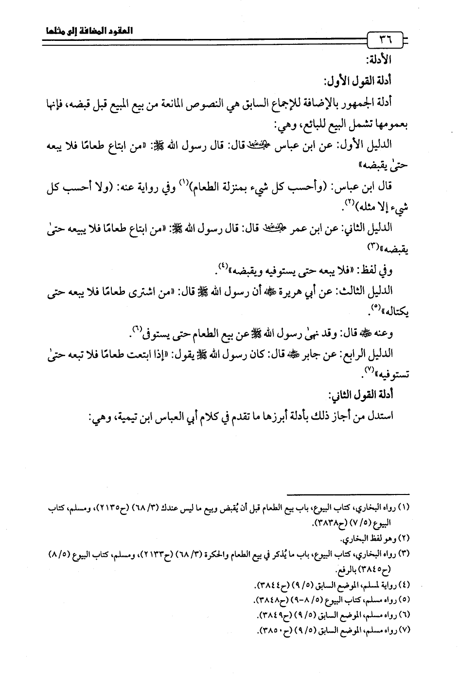 الدليل الأول: عن ابن عباس - رضي الله عنهما - قال: قال رسول الله - صلى الله عليه وسلم -: «من ابتاع طعامًا فلا يبعه حتى يقبضه»