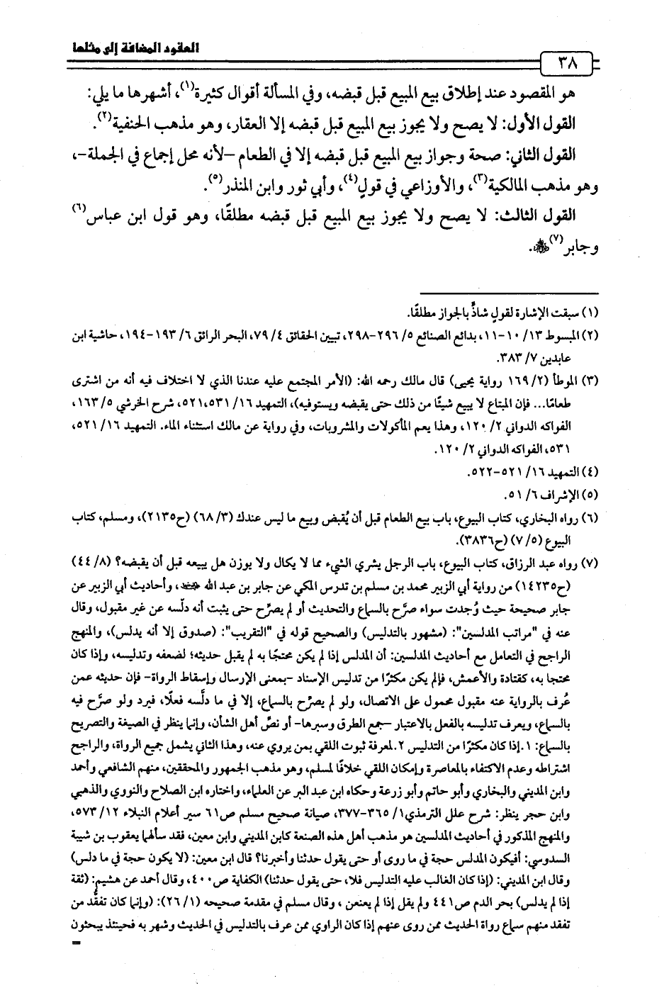 (¬7) رواه عبد الرزاق، كتاب البيوع، باب الرجل يشري الشيء مما لا يكال ولا يوزن هل يبيعه قبل أن يقبضه؟ (8/ 44) (ح 14235) من رواية أبي الزبير محمد بن مسلم بن تدرس المكي عن جابر بن عبد الله - رضي الله عنهما -، وأحاديث أبي الزبير عن جابر صحيحة حيث وُجدت سواء صرَّح بالسماع والتحديث أو لم يصرِّح حتى يثبت أنه دلّسه عن غير مقبول، وقال عنه في "مراتب المدلسين": (مشهور بالتدليس) والصحيح قوله في "التقريب": (صدوق إلا أنه يدلس)، والمنهج الراجح في التعامل مع أحاديث المدلسين: أن المدلس إذا لم يكن محتجًا به لم يقبل حديثه؛ لضعفه وتدليسه، وإذا كان محتجا به، كقتادة والأعمش، فإلم يكن مكثرًا من تدليس الإسناد -بمعنى الإرسال وإسقاط الرواة- فإن حديثه عمن عُرف بالرواية عنه مقبول محمول على الاتصال، ولو لم يصرِّح بالسماع، إلا في ما دلَّسه فعلًا، فيرد ولو صرَّح فيه بالسماع، ويعرف تدليسه بالفعل بالاعتبار -جمع الطرق وسبرها- أو نصِّ أهل الشأن، وإنما ينظر في الصيغة والتصريح بالسماع: 1.إذا كان مكثرًا من التدليس 2.لمعرفة ثبوت اللقي بمن يروي عنه، وهذا الثاني يشمل جميع الرواة، والراجح اشتراطه وعدم الاكتفاء بالمعاصرة وإمكان اللقي خلافًا لمسلم، وهو مذهب الجمهور والمحققين، منهم الشافعي وأحمد وابن المديني والبخاري وأبو حاتم وأبو زرعة وحكاه ابن عبد البر عن العلماء، واختاره ابن الصلاح والنووي والذهبي وابن حجر ينظر: شرح علل الترمذي 1/ 365 - 377، صيانة صحيح مسلم ص 61 سير أعلام النبلاء 12/ 573، والمنهج المذكور في أحاديث المدلسين هو مذهب أهل هذه الصنعة كابن المديني وابن معين، فقد سألهما يعقوب بن شيبة السدوسي: أفيكون المدلس حجة في ما روى أو حتى يقول حدثنا وأخبرنا؟ قال ابن معين: (لا يكون حجة في ما دلس) وقال ابن المديني: (إذا كان الغالب عليه التدليس فلا، حتى يقول حدثنا) الكفاية ص 400، وقال أحمد عن هشيم: (ثقة إذا لم يدلس) بحر الدم ص 441 ولم يقل إذا لم يعنعن، وقال مسلم في مقدمة صحيحه (1/ 26): (وإنما كان تفقُّد من تفقد منهم سماع رواة الحديث ممن روى عنهم إذا كان الراوي ممن عرف بالتدليس في الحديث وشهر به فحينئذ يبحثون عن سماعه في روايته ويتفقدون ذلك منه كي تنزاح عنهم علة التدليس) وهو قول عبد الله بن الزبير الحميدي وابن حزم وغيرهم. الكفاية ص 412، الإحكام 1/ 136 وإن كان ابن حزم وافق في التأصيل وخالف في التفريع، وأدلة ترجيحه تُذكر في موطنها. أما أبو الزبير فالأدلة على قبول ما رواه عن جابر بالعنعنة كثيرة، ألخص أهمها: 1.أنه معروف بالرواية عنه بل جاء في الجامع للخطيب البغدادي (1/ 238،233) عن أبي الزبير قوله: (كان عطاء يقدمني إلى جابر أحفظ لهم الحديث) وعن عطاء قوله: (كنا نكون عند جابر بن عبد الله فيحدثنا، فإذا خرجنا من عنده تذاكرنا حديثه. قال: فكان أبو الزبير أحفظنا للحديث) ورواه الدارمي (ح 639)، فينبغي أن يكون حديثه عن جابر أصح حديثه. 2.أنه لم يصفه بالتدليس إلا النسائي وصفًا مجملًا، وقد ترجم له البخاري ومسلم وابن معين والعجلي وابن سعد وابن أبي حاتم والعقيلي والدولابي وابن حبان وابن عدي، ومنهم من هو قبل النسائي ومنهم من هو بعده، ولم يصفوه بالتدليس مطلقًا، وكان شعبة يقول: (لا يحسن يصلي) (رأيته يزن ويسترجح في الميزان) تهذيب الكمال 26/ 407، ولو علمه مدلسًا لما سكت عن ذلك، مع كونه لا يستحل السكوت عمن علم فيهم ضعفًا ومع قوله: (لأن أسقط من السماء أحب إلي من أن أدلس) الكفاية ص 393، ورد على شعبة جمع منهم ابن حبان في "الثقات" وابن عبد البر في "الاستغناء" والذهبي-كما سيأتي-، وكل من قدح في أبي الزبير غير النسائي لم يذكر فيه تدليسًا غير المتأخرين، بل قال أبو عبد الله الحاكم: (معرفة الأحاديث المعنعنة وليس فيها تدليس، وهي متصلة بإجماع أئمة النقل على تورع رواتها عن أنواع التدليس، مثال ذلك) ثم أسند حديثًا مرفوعًا من رواية غير الليث عن أبي الزبير عن جابر وقال: (هذا حديث رواته بصريون ثم مدنيون ومكيون وليس من مذاهبهم التدليس، فسواء عندنا ذكروا سماعهم أولم يذكروه، وإنما جعلته مثالًا لألوفٍ مثله) معرفة علوم 