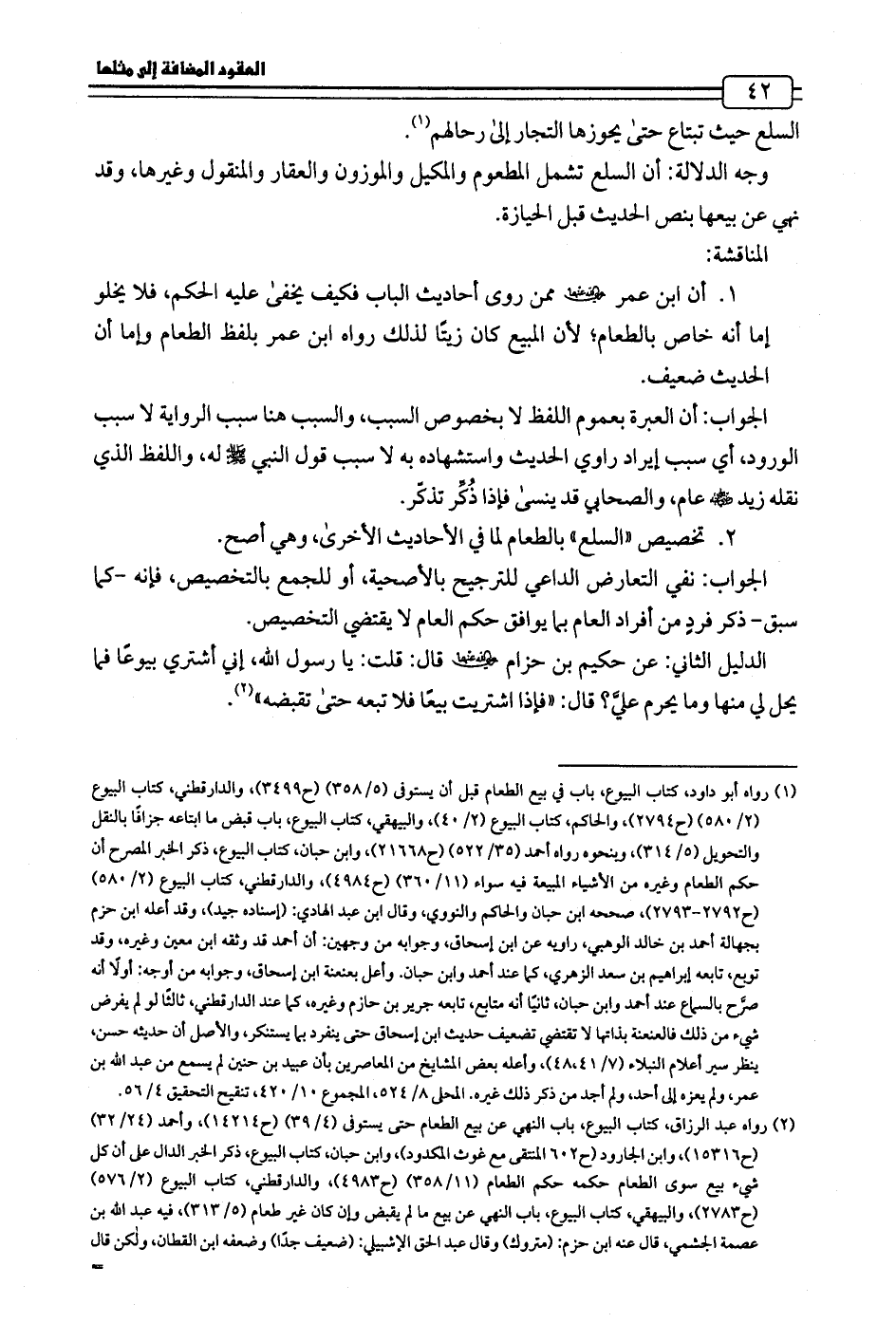 (¬1) رواه أبو داود، كتاب البيوع، باب في بيع الطعام قبل أن يستوفى (5/ 358) (ح 3499)، والدارقطني، كتاب البيوع (2/ 580) (ح 2794)، والحاكم، كتاب البيوع (2/ 40)، والبيهقي، كتاب البيوع، باب قبض ما ابتاعه جزافًا بالنقل والتحويل (5/ 314)، وبنحوه رواه أحمد (35/ 522) (ح 21668)، وابن حبان، كتاب البيوع، ذكر الخبر المصرح أن حكم الطعام وغيره من الأشياء المبيعة فيه سواء (11/ 360) (ح 4984)، والدارقطني، كتاب البيوع (2/ 580) (ح 2792 - 2793)، صححه ابن حبان والحاكم والنووي، وقال ابن عبد الهادي: (إسناده جيد)، وقد أعله ابن حزم بجهالة أحمد بن خالد الوهبي، راويه عن ابن إسحاق، وجوابه من وجهين: أن أحمد قد وثقه ابن معين وغيره، وقد توبع، تابعه إبراهيم بن سعد الزهري، كما عند أحمد وابن حبان. وأعل بعنعنة ابن إسحاق، وجوابه من أوجه: أولًا أنه صرَّح بالسماع عند أحمد وابن حبان، ثانيًا أنه متابع، تابعه جرير بن حازم وغيره، كما عند الدارقطني، ثالثًا لو لم يفرض شيء من ذلك فالعنعنة بذاتها لا تقتضي تضعيف حديث ابن إسحاق حتى ينفرد بما يستنكر، والأصل أن حديثه حسن، ينظر سير أعلام النبلاء (7/ 48،41)، وأعله بعض المشايخ من المعاصرين بأن عبيد بن حنين لم يسمع من عبد الله بن عمر، ولم يعزه إلى أحد، ولم أجد من ذكر ذلك غيره. المحلى 8/ 524، المجموع 10/ 420، تنقيح التحقيق 4/ 56.