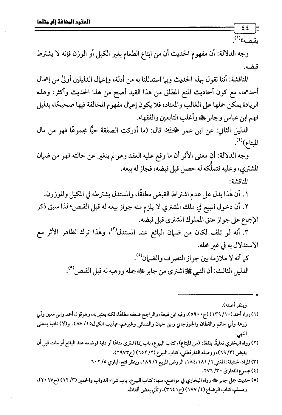 1. أن هذا يدل على عدم اشتراط القبض مطلقًا، والمستدل يشترطه في المكيل والموزون.
