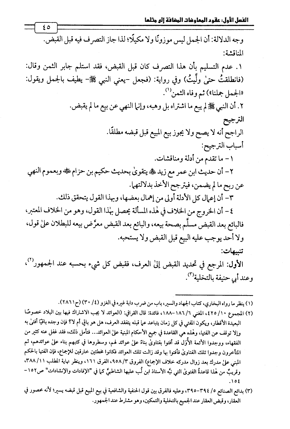 1. عدم التسليم بأن هذا التصرف كان قبل القبض، فقد استلم جابر الثمن وقال: (فانطلقتُ حتى ولَّيتُ) وفي رواية: (فجعل -يعني النبي - صلى الله عليه وسلم - يطيف بالجمل ويقول: «الجمل جملنا») ثم وفاه الثمن (¬1).