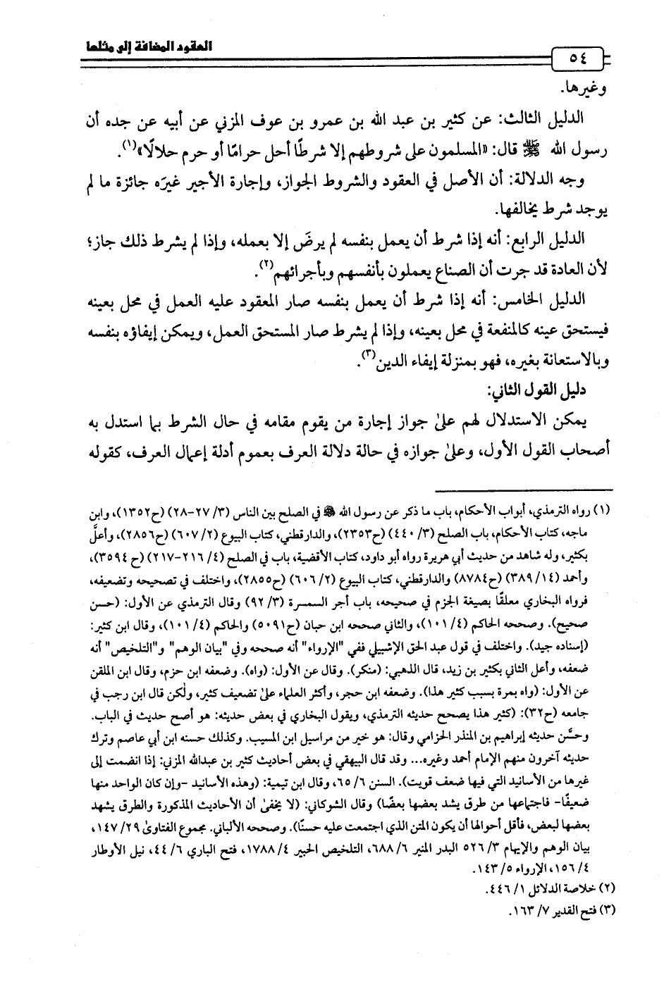 (¬1) رواه الترمذي، أبواب الأحكام، باب ما ذكر عن رسول الله - صلى الله عليه وسلم - في الصلح بين الناس (3/ 27 - 28) (ح 1352)، وابن ماجه، كتاب الأحكام، باب الصلح (3/ 440) (ح 2353)، والدارقطني، كتاب البيوع (2/ 607) (ح 2856)، وأعلَّ بكثير، وله شاهد من حديث أبي هريرة رواه أبو داود، كتاب الأقضية، باب في الصلح (4/ 216 - 217) (ح 3594)، وأحمد (14/ 389) (ح 8784) والدارقطني، كتاب البيوع (2/ 606) (ح 2855)، واختلف في تصحيحه وتضعيفه، فرواه البخاري معلقًا بصيغة الجزم في صحيحه، باب أجر السمسرة (3/ 92) وقال الترمذي عن الأول: (حسن صحيح). وصححه الحاكم (4/ 101)، والثاني صححه ابن حبان (ح 5091) والحاكم (4/ 101)، وقال ابن كثير: (إسناده جيد). واختلف في قول عبد الحق الإشبيلي ففي "الإرواء" أنه صححه وفي "بيان الوهم" و"التلخيص" أنه ضعفه، وأعل الثاني بكثير بن زيد، قال الذهبي: (منكر). وقال عن الأول: (واه). وضعفه ابن حزم، وقال ابن الملقن عن الأول: (واه بمرة بسبب كثير هذا). وضعفه ابن حجر، وأكثر العلماء على تضعيف كثير، ولكن قال ابن رجب في جامعه (ح 32): (كثير هذا يصحح حديثه الترمذي، ويقول البخاري في بعض حديثه: هو أصح حديث في الباب. وحسَّن حديثه إبراهيم بن المنذر الحزامي وقال: هو خير من مراسيل ابن المسيب. وكذلك حسنه ابن أبي عاصم وترك حديثه آخرون منهم الإمام أحمد وغيره ... وقد قال البيهقي في بعض أحاديث كثير بن عبدالله المزني: إذا انضمت إلى غيرها من الأسانيد التي فيها ضعف قويت). السنن 6/ 65، وقال ابن تيمية: (وهذه الأسانيد -وإن كان الواحد منها ضعيفًا- فاجتماعها من طرق يشد بعضها بعضًا) وقال الشوكاني: (لا يخفى أن الأحاديث المذكورة والطرق يشهد بعضها لبعض، فأقل أحوالها أن يكون المتن الذي اجتمعت عليه حسنًا). وصححه الألباني. مجموع الفتاوى 29/ 147، بيان الوهم والإيهام 3/ 526 البدر المنير 6/ 688، التلخيص الحبير 4/ 1788، فتح الباري 6/ 44، نيل الأوطار 4/ 156، الإرواء 5/ 143.
