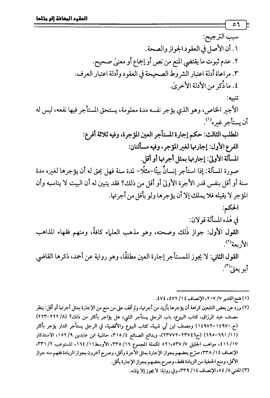 (¬2) ورد عن بعض التابعين كراهة أن يؤجرها بأزيد من أجرتها، ولم أقف على من منع من الإجارة بمثل أجرتها أو أقل: ينظر مصنف عبد الرزاق، كتاب البيوع، باب الرجل يستأجر الشيء هل يؤاجر بأكثر من ذلك؟ (8/ 222 - 223) (ح.14970 - 14972) ومصنف ابن أبي شيبة، كتاب البيوع والأقضية، في الرجل يستأجر الدار يؤجر بأكثر (11/ 691 - 695) (ح 23746 - 23772)، وبدائع الصنائع 4/ 315، حاشية ابن عابدين 9/ 152، الاستذكار 17/ 416، مواهب الجليل 7/ 521،537 تكملة المجموع 16/ 335، الأوسط 11/ 164، المستوعب 2/ 331، الإنصاف 14/ 338، صرّح بعضهم بجواز الإجارة بمثل الأجرة وأقل، وصرح آخرون بجواز الزيادة ففهم منه جواز الأقل، ومنع الحنفية من الزيادة فقط، وصرح بعضهم بجواز الإجارة بأقل.