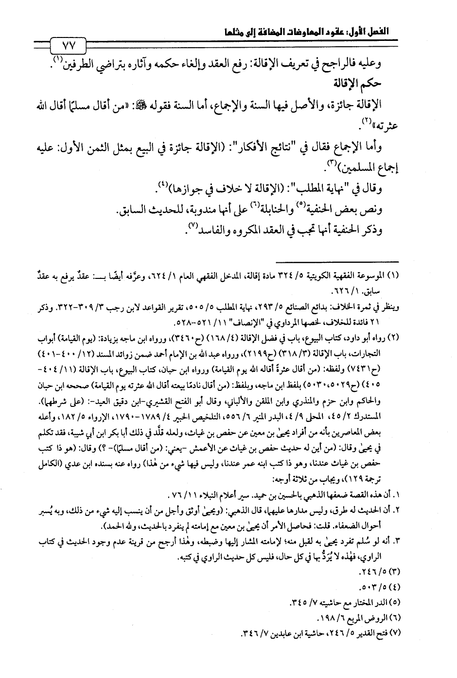 (¬2) رواه أبو داود، كتاب البيوع، باب في فضل الإقالة (4/ 168) (ح 3460)، ورواه ابن ماجه بزيادة: (يوم القيامة) أبواب التجارات، باب الإقالة (3/ 318) (ح 2199)، ورواه عبد الله بن الإمام أحمد ضمن زوائد المسند (12/ 400 - 401) (ح 7431) ولفظه: (من أقال عثرةً أقاله الله يوم القيامة) ورواه ابن حبان، كتاب البيوع، باب الإقالة (11/ 404 - 405) (ح 5030،5029) بلفظ ابن ماجه، وبلفظ: (من أقال نادمًا بيعته أقال الله عثرته يوم القيامة) صححه ابن حبان والحاكم وابن حزم والمنذري وابن الملقن والألباني، وقال أبو الفتح القشيري-ابن دقيق العيد-: (على شرطهما). المستدرك 2/ 45، المحلى 9/ 4، البدر المنير 6/ 556، التلخيص الحبير 4/ 1789 - 1790، الإرواء 5/ 182، وأعله بعض المعاصرين بأنه من أفراد يحيى بن معين عن حفص بن غياث، ولعله قلَّد في ذلك أبا بكر ابن أبي شيبة، فقد تكلم في يحيى وقال: (من أين له حديث حفص بن غياث عن الأعمش -يعني: (من أقال مسلمًا) -؟) وقال: (هو ذا كتب حفص بن غياث عندنا، وهو ذا كتب ابنه عمر عندنا، وليس فيها شيء من هذا) رواه عنه بسنده ابن عدي (الكامل ترجمة 129)، ويجاب من ثلاثة أوجه: