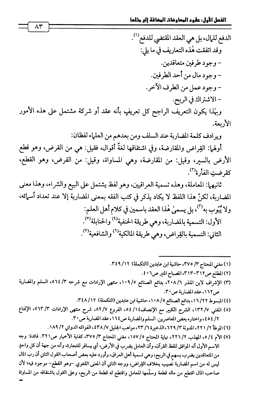 (¬7) الأم 4/ 5، المهذب 2/ 226، نهاية المحتاج 5/ 157، مغني المحتاج 3/ 375، كفاية الأخيار ص 321. فائدة: وجه الاسم الأول أنه الموافق للفظ القرآن, وأن العامل يضرب في الأرض، أي يسافر للتجارة، وأنه من جهة أن كل واحدٍ من المتعاقدين يضرب بسهمٍ في الربح، وهي تسمية أهل العراق، وأورد عليه بعض أصحاب القول الثاني أن رب المال ليس له من اسم المضاربة نصيب بخلاف القِراض، ووجه الثاني أن المعنى اللغوي -وهو القطع- موجود فيه؛ لأن صاحب المال اقتطع من ماله قطعة وسلّمها للعامل واقتطع له قطعة من الربح، وعلى القول باشتقاقه من المساواة والموازنة فقد بذل العامل العمل وربُّ المالِ المالَ فتوازنا، واستخدمه الصحابة -كما في الموطأ-: (لو جعلته قِراضًا)، وقالوا: (الصحابة - رضي الله عنهم - هم أهل اللسان وأرباب البيان، وإذا كان يحتج في اللغة بقول امراء القيس والنابغة فالحجة بقول هؤلاء أولى وأقوى) قاله ابن رشد الجد في "المقدمات الممهدات" 3/ 6، وينظر "مواهب الجليل" 7/ 439، ولا مشاحّة في الاصطلاح إذا فُهم المعنى؛ لأن العبرة بالحقائق والمعاني لا بالألفاظ والمباني، خاصّةً في باب العقود والمعاملات، وأصحاب القول الأول قد نصّوا على انعقاد العقد باللفظ الثاني (بدائع الصنائع 5/ 109، الشرح الكبير 14/ 54 - 55) وأشار إلى ذلك بعض أصحاب القول الثاني (مغني المحتاج 3/ 375)، والحمد لله.