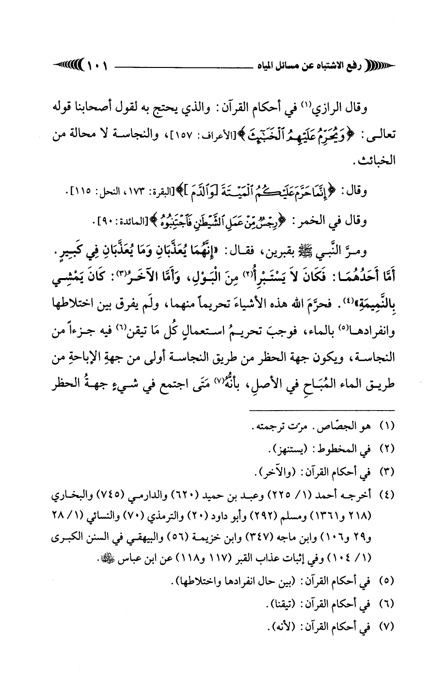 ومرَّ النَّبي - صَلَّى الله عليه وسلم - بقبرين، فقال: "إنَّهُمَا يُعَذَّبَانِ وَمَا يُعَذَّبَانِ فِي كبِيرٍ. أَمَّا أَحَدُهُمَا: فَكَانَ لاَ يَسْتَبْرِأُ (¬2) مِنَ الْبَوْلِ، وَأَمَّا الآخَرُ (¬3): كَانَ يَمْشِي بِالنَّمِيمَةِ" (¬4). فحرَّمَ الله هذه الأشياءَ تحريماً منهما، ولَم يفرق بين اختلاطها وانفرادها (¬5) بالماء، فوجبَ تحريمُ استعمالٍ كُل مَا تيقن (¬6) فيه جزءًا من النجاسة، ويكون جهة الحظر من طريق النجاسة أولى من جهةِ الإباحةِ من طريق الماء المُبَاحِ في الأصلِ، بأنُّهُ (¬7) مَتَى اجتمع في شيءٍ جهةُ الحظر