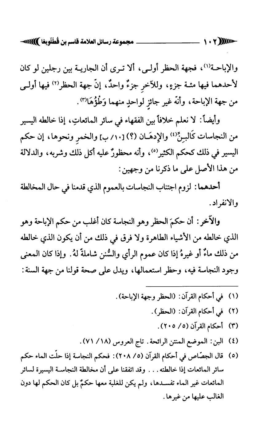 (¬5) قال الجصَّاص في أحكام القرآن (5/ 208): فحكم النجاسة إذا حلَّت الماء حكم سائر المائعات إذا خالطته. . . وقد اتفقنا على أن مخالطة النجاسة اليسيرة سائر المائعات غير الماء تفسدها، ولم يكن للغلبة معها حكمٌ بل كان الحكم لها دون الغالب عليها من غيرها.