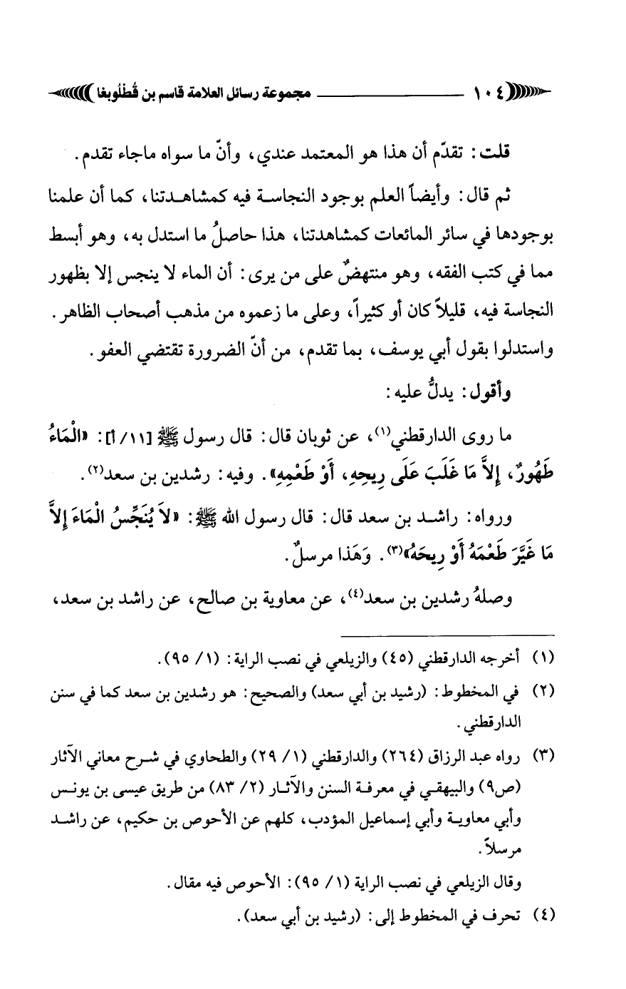 (¬3) رواه عبد الرَّزاق (264) والدارقطني (1/ 29) والطحاوي في شرح معاني الآثار (ص 9) والبيهقي في معرفة السنن والآثار (2/ 83) من طريق عيسى بن يونس وأبي معاوية وأبي إسماعيل المؤدب، كلهم عن الأحوص بن حكيم، عن راشد مرسلاً.