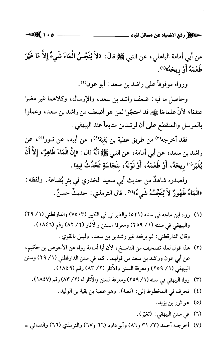 عن أبي أمامة الباهلي، عن النَّبيِّ - صلى الله عليه وسلم - قالَ: "لاَ يُنَجِّسُ الْمَاءَ شَيءٌ إِلاَّ مَا غَيَّرَ طَعْمَهُ أَوْ رِيحَهُ" (¬1).