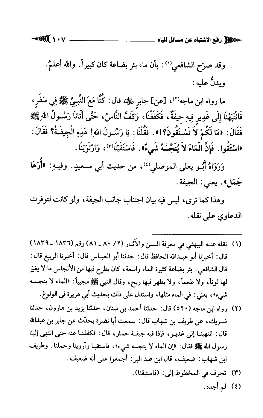 (¬2) رواه ابن ماجه (520) قال: حدّثنا أحمد بن سنان، حدّثنا يزيد بن هارون، حدّثنا شريك، عن طريف بن شهاب قال: سمعت أبا نضرة يحدث عن جابر بن عبد الله قال: انتهينا إلى غدير، فإذا فيه جيفة حمار، قال: فكففنا عنه حتَّى انتهى إلينا رسول الله - صَلَّى الله عليه وسلم - فقال: "إن الماء لا ينجسه شيء"، فاستقينا وأروينا وحملنا. وطريف ابن شهاب: ضعيف، قال ابن عبد البر: أجمعوا على أنه ضعيف.