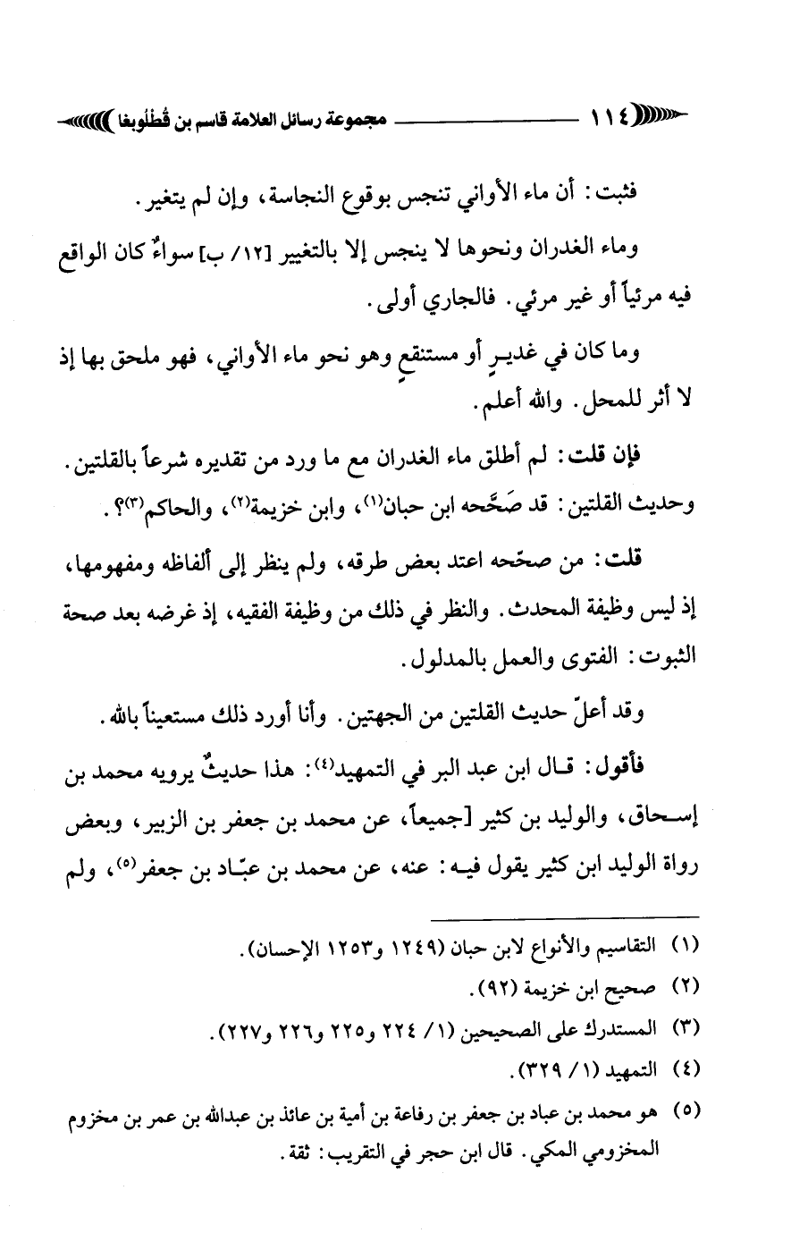 فإن قلت: لم أطلق ماء الغدران مع ما ورد من تقديره شرعًا بالقلتين. وحديث القلتين: قد صَحَّحه ابن حبان (¬1)، وابن خزيمة (¬2)، والحاكم (¬3)؟.