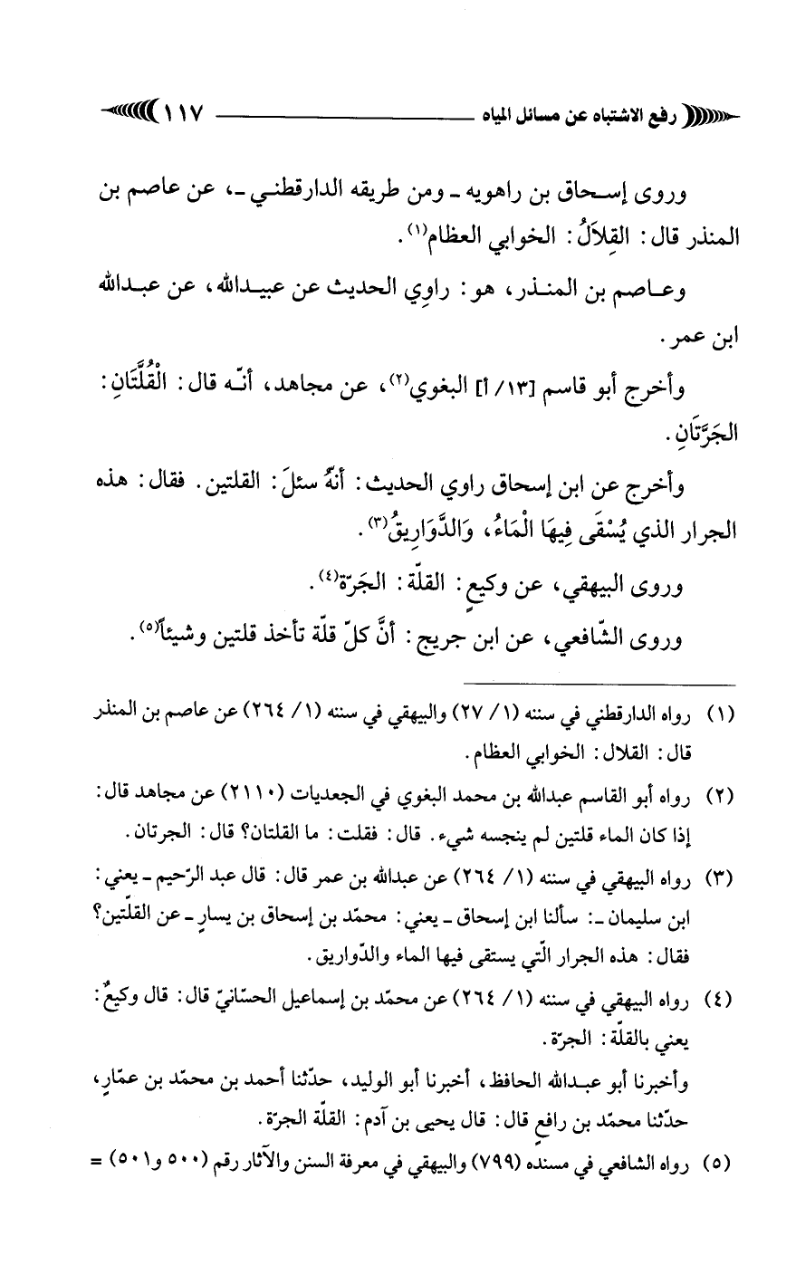 (¬3) رواه البيهقي في سننه (1/ 264) عن عبد الله بن عمر قال: قال عبد الرحيم -يعني: ابن سليمان-: سألنا ابن إسحاق -يعني: محمد بن إسحاق بن يسارٍ- عن القلّتين؟ فقال: هذه الجرار الّتي يستقى فيها الماء والدّواريق.