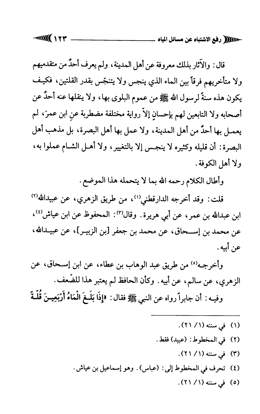 قال: والآثار بذلك معروفة عن أهل المدينة، ولم يعرف أحدٌ من متقدميهم ولا متأخريهم فرقًا بين الماء الذي ينجس ولا يتنجّس بقدر القلتين، فكيف يكون هذه سنةً لرسول الله - صَلَّى الله عليه وسلم - من عموم البلوى بها، ولا ينقلها عنه أحدٌ عن أصحابه ولا التابعين لهم بإحسانٍ إلاّ رواية مختلفة مضطربة عنِ ابن عمرَ، لم يعمل بها أحدٌ من أهل المدينة، ولا عمل بها أهل البصرة، بل مذهب أهل البصرة: أن قليله وكثيره لا ينجس إلَّا بالتغيير، ولا أهل الشام عملوا به، ولا أهل الكوفة.