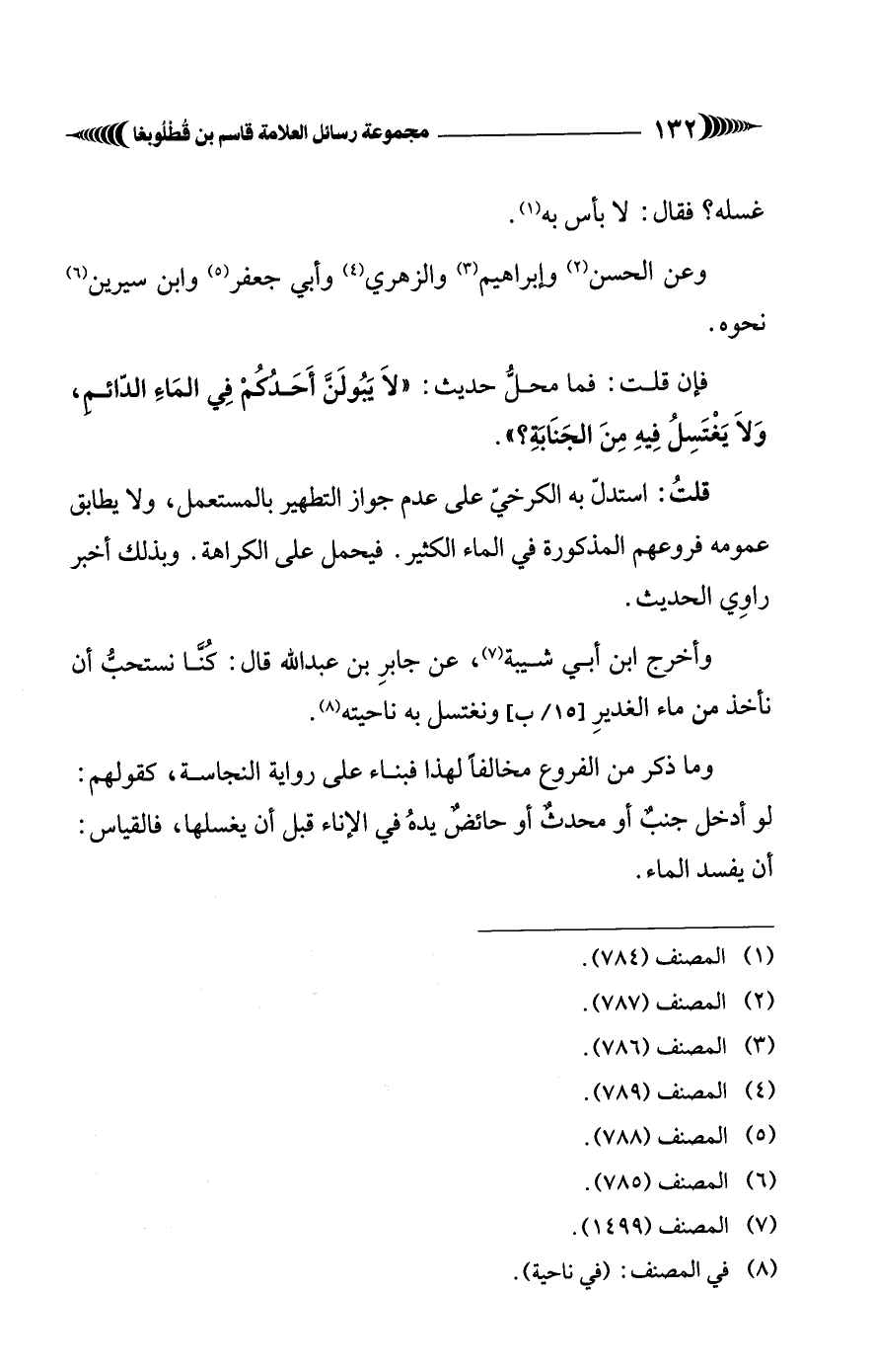 قلتُ: استدلّ به الكرخيّ على عدم جواز التطهير بالمستعمل، ولا يطابق عمومه فروعهم المذكورة في الماء الكثير. فيحمل على الكراهة. وبذلك أخبر راوِي الحديث.