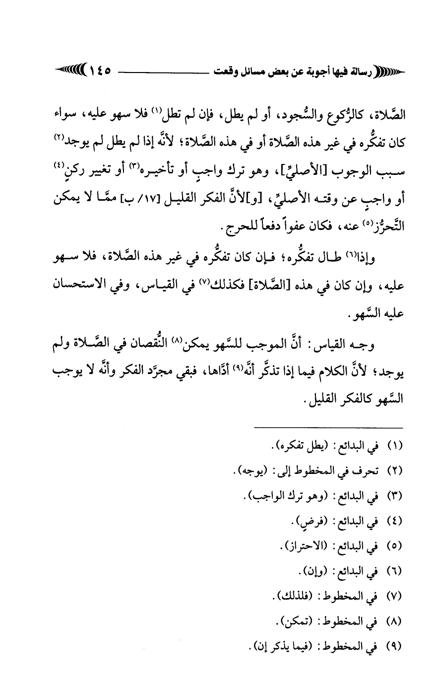 الصَّلاة، كالرُّكوع والسُّجود، أو لم يطل، فإن لم تطل (¬1) فلا سهو عليه، سواء كان تفكُّره في غير هذه الصَّلاة أو في هذه الصَّلاة؛ لأنَّه إذا لم يطل لم يوجد (¬2) سبب الوجوب [الأصليِّ]، وهو ترك واجبٍ أو تأخيره (¬3) أو تغيير ركنٍ (¬4) أو واجبٍ عن وقته الأصليِّ، [و] لأنَّ الفكر القليل [17 / ب] ممَّا لا يمكن التَّحرُّز (¬5) عنه، فكان عفواً دفعًا للحرج.