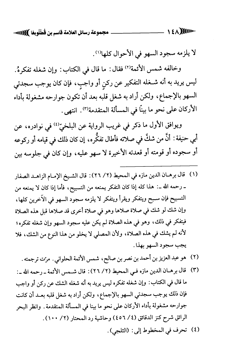 (¬1) قال برهان الدين مازه في المحيط (2/ 26): قال الشيخ الإمام الزَّاهد الصفار - رحمه الله -: هذا كله إذا كان التفكر يمنعه من التسبيح، فأما إذا كان لا يمنعه من التسبيح فإن سبح ويتفكر ويقرأ ويتفكر لا يلزمه سجود السهو في الآخرين كلها، وإن شك لو شك في صلاة صلاها وهو في صلاة أخرى قد صلاها قبل هذه الصلاة فيتفكر في ذلك، وهو في هذه الصلاة لم يكن عليه سجود السهو وإن شغله تفكره؛ لأنَّه لم يشك في هذه الصلاة، ولأن المصلي لا يخلو من هذا النوع من الشك، فلا يجب سجود السهو بهذا.