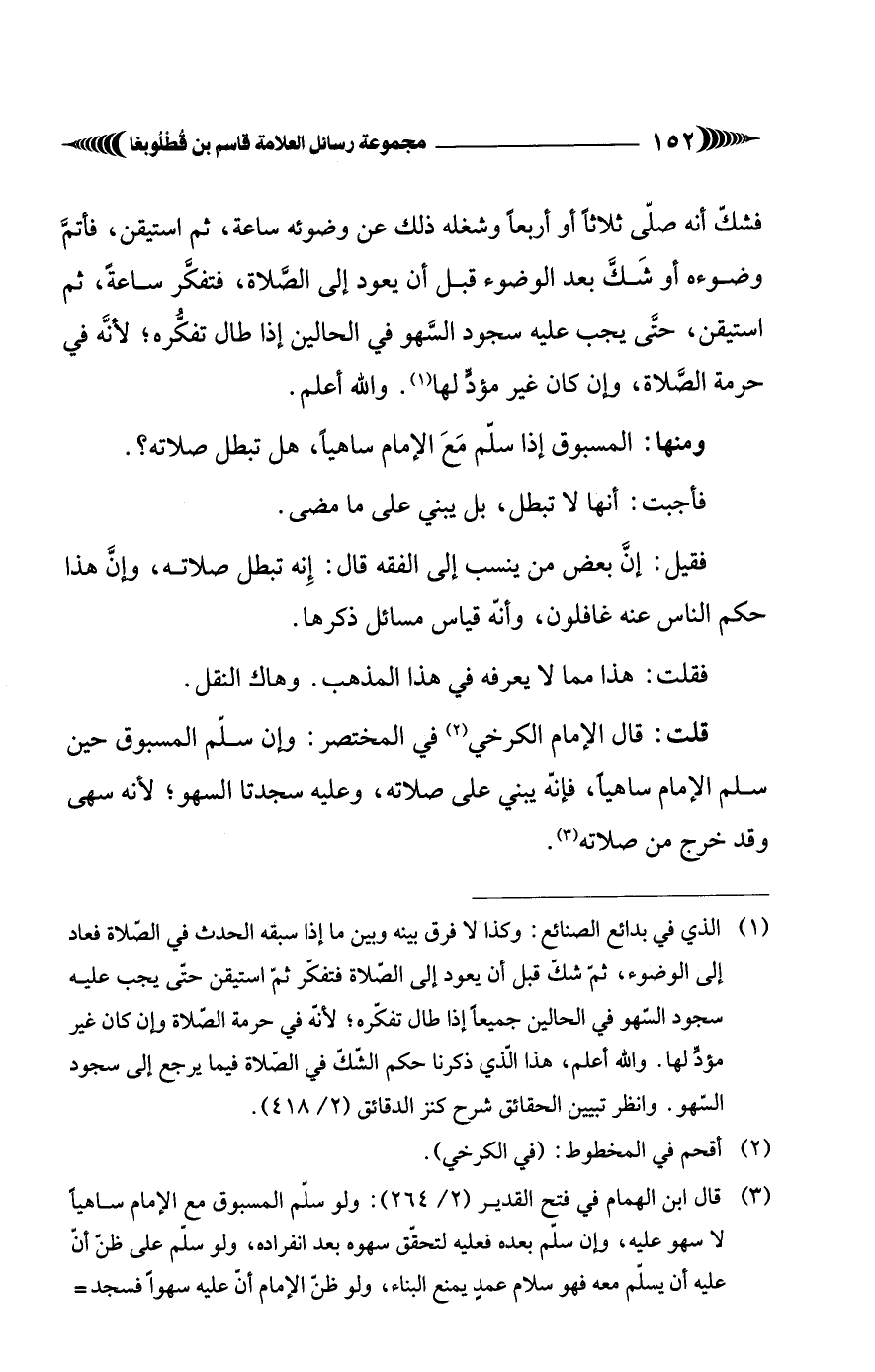 (¬1) الذي في بدائع الصنائع: وكذا لا فرق بينه وبين ما إذا سبقه الحدث في الصَّلاة فعاد إلى الوضوء، ثمّ شكّ قبل أن يعود إلى الصَّلاة فتفكر ثمّ استيقن حتَّى يجب عليه سجود السَّهو في الحالين جميعًا إذا طال تفكُّره؛ لأنة في حرمة الصَّلاة وإن كان غير مؤدٍّ لها. والله أعلم، هذا الَّذي ذكرنا حكم الشّكّ في الصَّلاة فيما يرجع إلى سجود السّهو. وانظر تبيين الحقائق شرح كنز الدقائق (2/ 418).