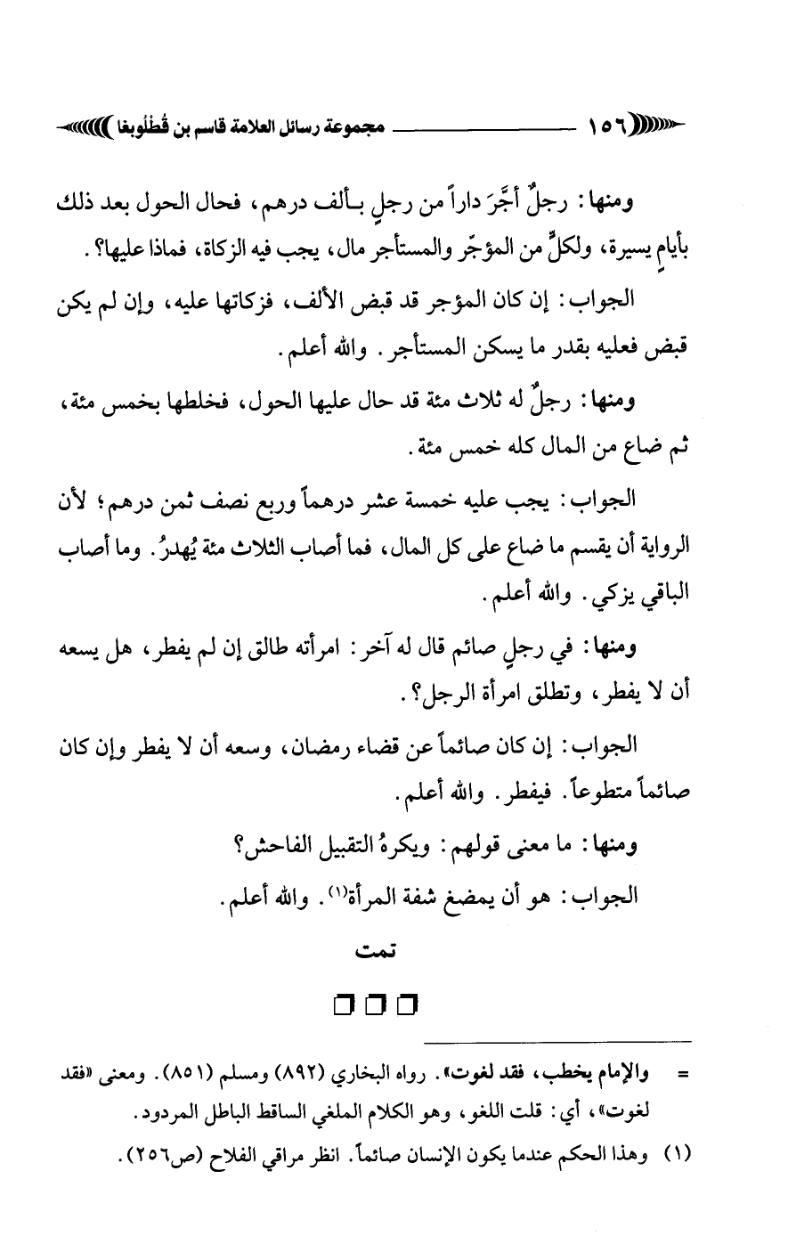 ومنها: رجلٌ أجَّرَ دارًا من رجلٍ بألف درهم، فحال الحول بعد ذلك بأيامٍ يسيرة، ولكلٍّ من المؤجّر والمستأجر مال، يجب فيه الزكاة، فماذا عليها؟.