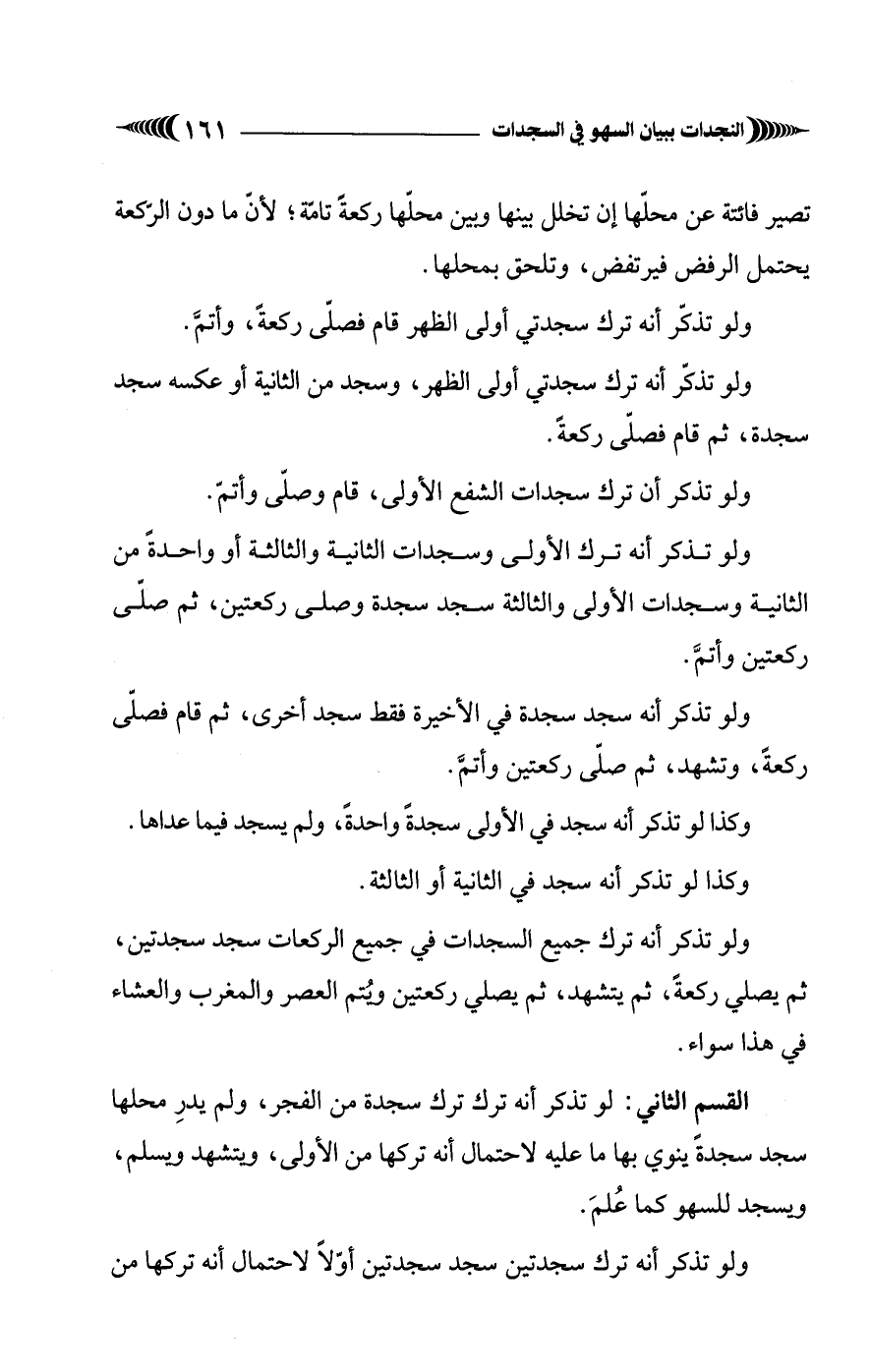 القسم الثاني: لو تذكّر أنه ترك ترك سجدة من الفجر، ولم يدرِ محلها سجد سجدةً ينوي بها ما عليه لاحتمال أنه تركها من الأولى، ويتشهد ويسلم، ويسجد للسهو كما عُلمَ.