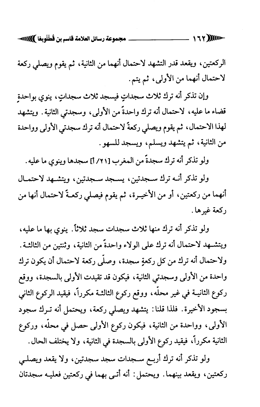 ولو تذكّر أنه ترك منها ثلاث سجدات سجد ثلاثًا. ينوي بها ما عليه، ويتشهد لاحتمال أنه ترك على الولاء واحدة من الثَّانية، وثنتين من الثالثة. ولاحتمال أنه ترك من كل ركعةٍ سجدة، وصلّى ركعة لاحتمال أن يكون ترك واحدة من الأولى وسجدتي الثَّانية، فيكون قد تقيدت الأولى بالسجدة، ووقع ركوع الثَّانية في غير محلّه، ووقع ركوع الثالثة مكرراً، فيقيد الركوع الثاني بسجود الأخيرة. فلذا قلنا: يتشهد ويصلّي ركعة، ويحتمل أنه ترك سجود الأولى، وواحدة من الثَّانية، فيكون ركوع الأولى حصل في محلّه، وركوع الثَّانية مكرراً، فيقيد ركوع الأولى بالسجدة في الثَّانية، ولا يختلف الحال. ولو تذكّر أنه ترك أربع سجدات سجد سجدتين، ولا يقعد ويصلي ركعتين، ويقعد بينهما. ويحتمل: أنه أتى بهما في ركعتين فعليه سجدتان