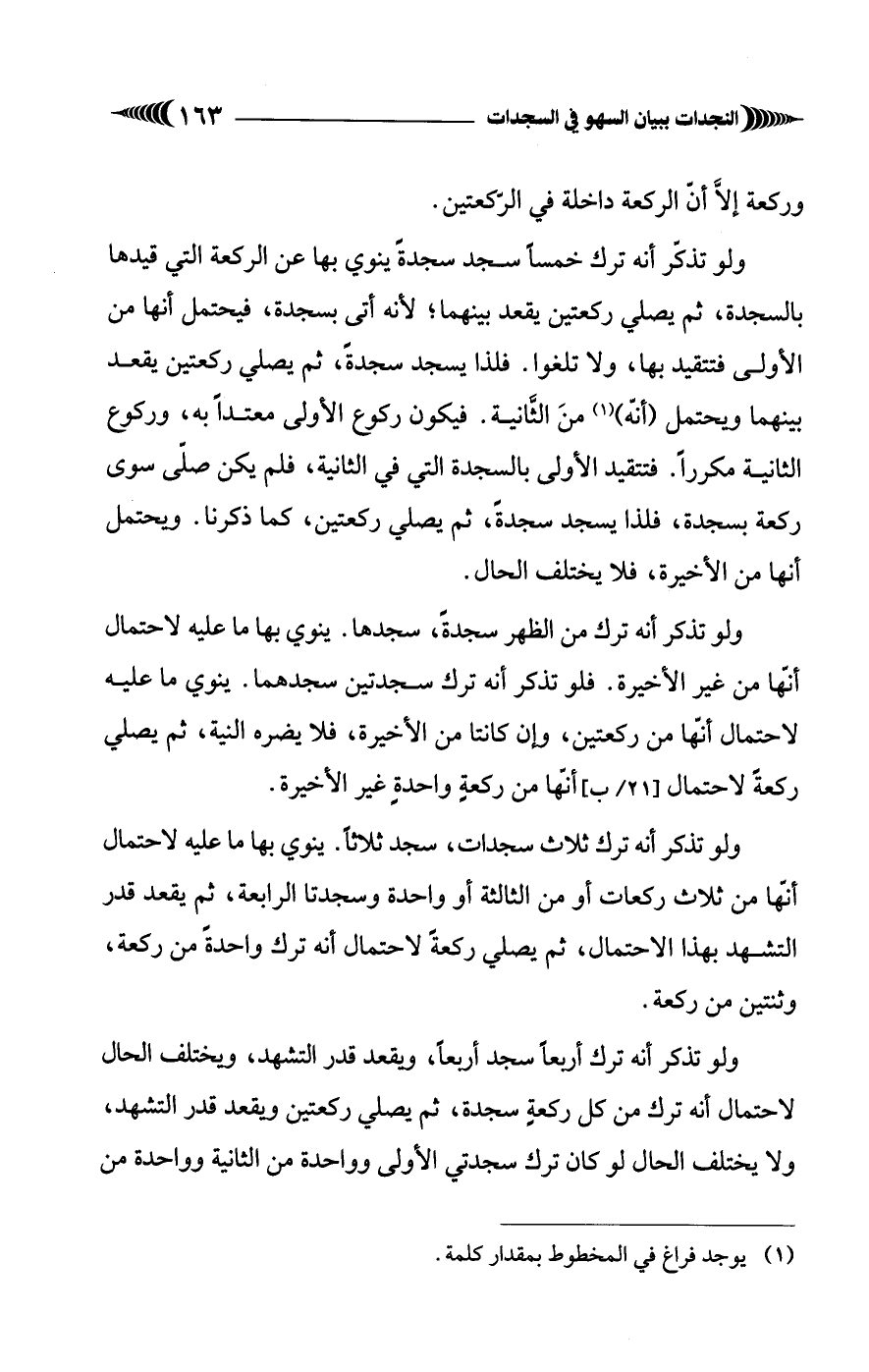 ولو تذكّر أنه ترك خمسًا سجد سجدةً ينوي بها عن الركعة التي قيدها بالسجدة، ثم يصلِّي ركعتين يقعد بينهما؛ لأنَّه أتى بسجدة، فيحتمل أنها من الأولى فتتقيد بها، ولا تلغوا. فلذا يسجد سجدةً، ثم يصلِّي ركعتين يقعد بينهما ويحتمل (أنّه) (¬1) منَ الثَّانية. فيكون ركوع الأولى معتدًا به، وركوع الثَّانية مكرراً. فتتقيد الأولى بالسجدة التي في الثَّانية، فلم يكن صَلَّى سوى ركعة بسجدة، فلذا يسجد سجدةً، ثم يصلِّي ركعتين، كما ذكرنا. ويحتمل أنها من الأخيرة، فلا يختلف الحال.