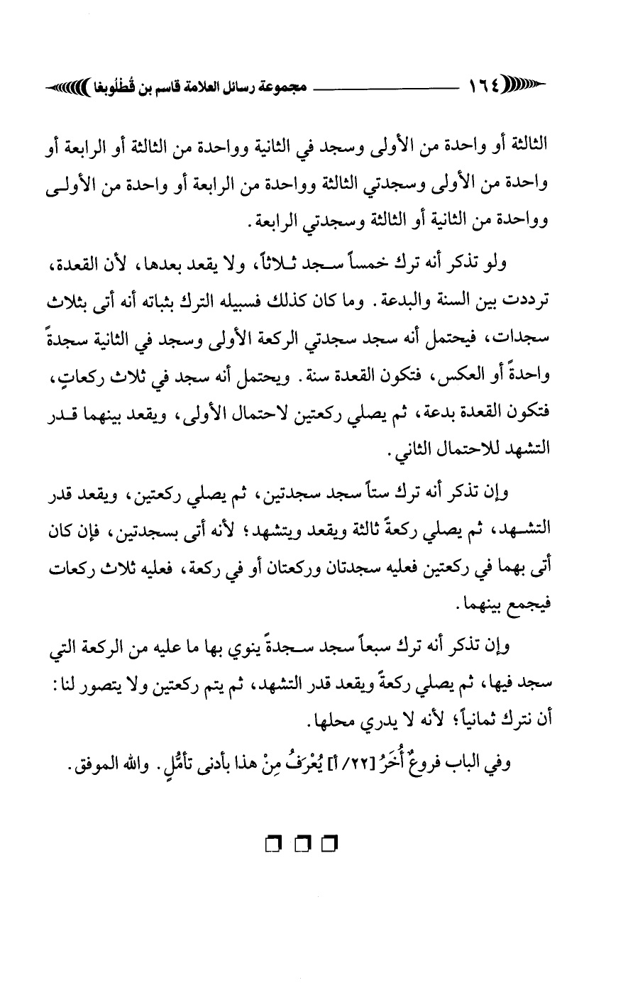 ولو تذكّر أنه ترك خمسًا سجد ثلاثًا، ولا يقعد بعدها، لأنَّ القعدة، ترددت بين السنة والبدعة. وما كان كذلك فسبيله الترك بثباته أنه أتى بثلاث سجدات، فيحتمل أنه سجد سجدتي الركعة الأولى وسجد في الثَّانية سجدةً واحدةً أو العكس، فتكون القعدة سنة. ويحتمل أنه سجد في ثلاث ركعاتٍ، فتكون القعدة بدعة، ثم يصلِّي ركعتين لاحتمال الأولى، ويقعد بينهما قدر التشهد للاحتمال الثاني.