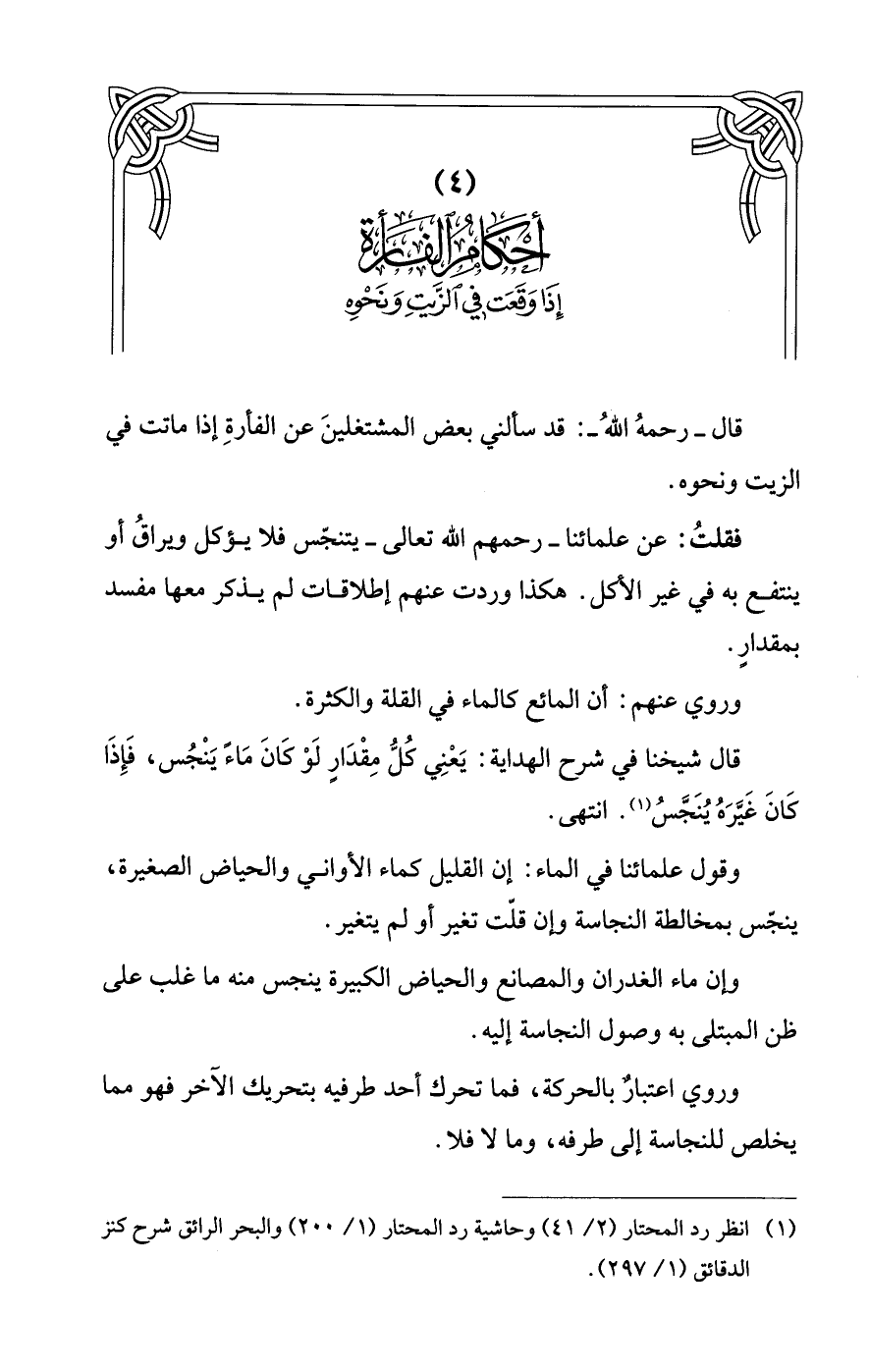 قال - رحمهُ اللهُ -: قد سألني بعض المشتغلينَ عن الفأرةِ إذا ماتت في الزيت ونحوه.