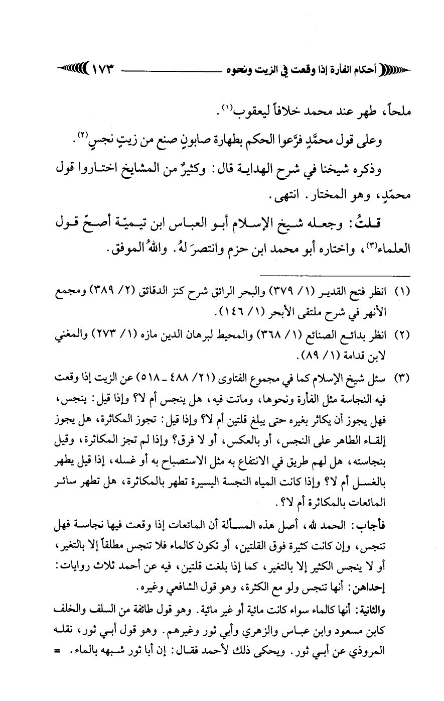 (¬3) سئل شيخ الإسلام كما في مجموع الفتاوى (21/ 488 - 518) عن الزيت إذا وقعت فيه النجاسة مثل الفأرة ونحوها، وماتت فيه، هل ينجس أم لا؟ وإذا قيل: ينجس، فهل يجوز أن يكاثر بغيره حتَّى يبلغ قلتين أم لا؟ وإذا قيل: تجوز المكاثرة، هل يجوز إلقاء الطاهر على النجس، أو بالعكس، أو لا فرق؟ وإذا لم تجز المكاثرة، وقيل بنجاسته، هل لهم طريق في الانتفاع به مثل الاستصباح به أو غسله، إذا قيل يطهر بالغسل أم لا؟ وإذا كانت المياه النجسة اليسيرة تطهر بالمكاثرة، هل تطهر سائر المائعات بالمكاثرة أم لا؟.