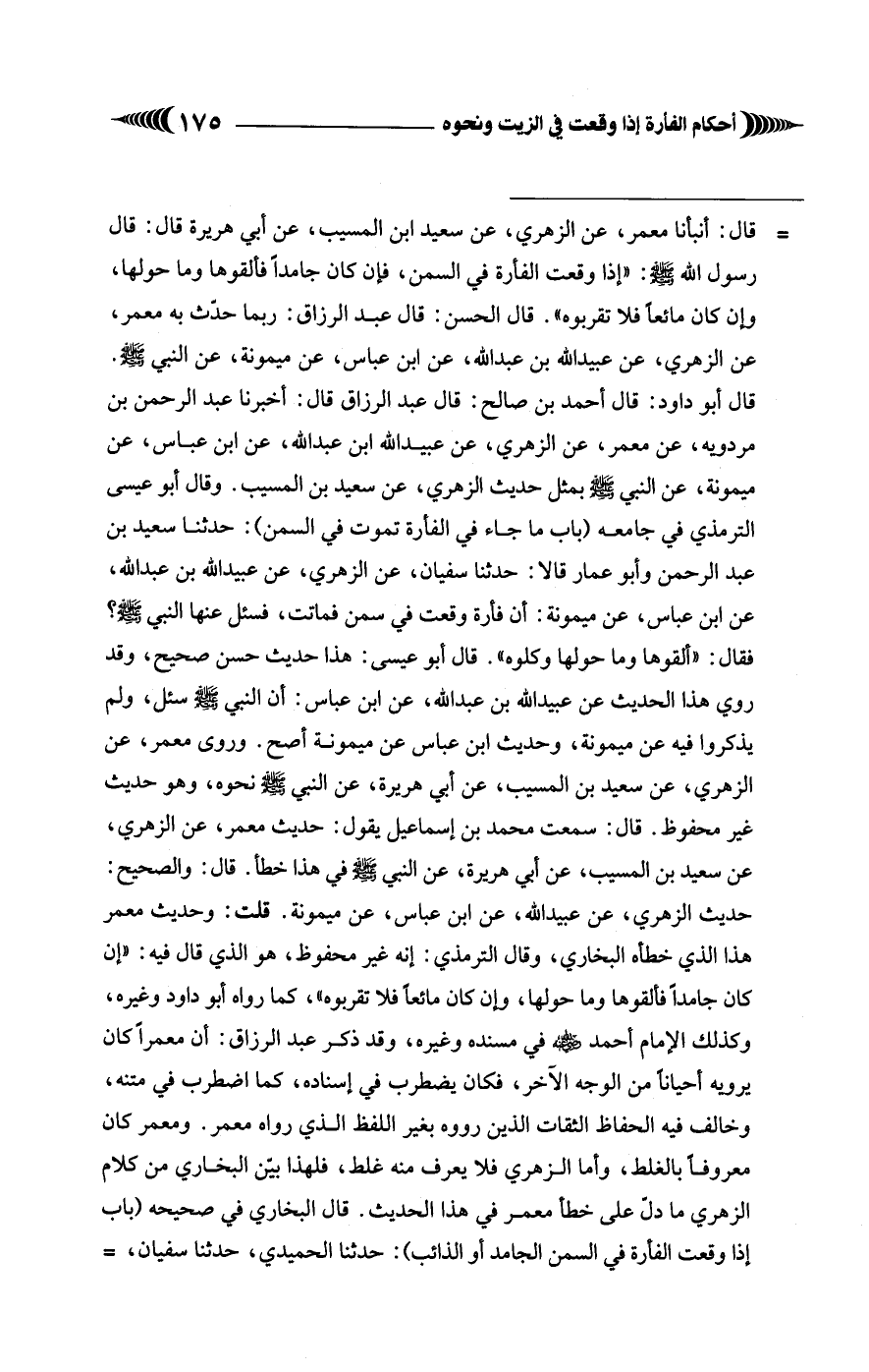 = قال: أنبأنا معمر، عن الزُّهريّ، عن سعيد ابن المسيب، عن أبي هريرة قال: قال رسول الله - صلى الله عليه وسلم -: "إذا وقعت الفأرة في السمن، فإن كان جامداً فألقوها وما حولها، وإن كان مائعاً فلا تقربوه". قال الحسن: قال عبد الرَّزاق: ربما حدّث به معمر، عن الزُّهريّ، عن عبيد الله بن عبد الله، عن ابن عباس، عن ميمونة، عن النَّبيِّ - صلى الله عليه وسلم -. قال أبو داود: قال أحمد بن صالح: قال عبد الرَّزاق قال: أخبرنا عبد الرحمن بن مردويه، عن معمر، عن الزُّهريّ، عن عبيد الله ابن عبد الله، عن ابن عباس، عن ميمونة، عن النَّبيِّ - صَلَّى الله عليه وسلم - بمثل حديث الزُّهريّ، عن سعيد بن المسيب. وقال أبو عيسى التِّرمذيُّ في جامعه (باب ما جاء في الفأرة تموت في السمن): حدّثنا سعيد بن عبد الرحمن وأبو عمار قالا: حدّثنا سفيان، عن الزُّهريّ، عن عبيد الله بن عبد الله، عن ابن عباس، عن ميمونة: أن فأرة وقعت في سمن فماتت، فسئل عنها النَّبيّ - صلى الله عليه وسلم -؟ فقال: "ألقوها وما حولها وكلوه". قال أبو عيسى: هذا حديث حسن صحيح، وقد روي هذا الحديث عن عبيد الله بن عبد الله، عن ابن عباس: أن النَّبيَّ - صلى الله عليه وسلم - سئل، ولم يذكروا فيه عن ميمونة، وحديث ابن عباس عن ميمونة أصح. وروى معمر، عن الزُّهريّ، عن سعيد بن المسيب، عن أبي هريرة، عن النَّبيِّ - صلى الله عليه وسلم - نحوه، وهو حديث غير محفوظ. قال: سمعت محمد بن إسماعيل يقول: حديث معمر، عن الزُّهريّ، عن سعيد بن المسيب، عن أبي هريرة، عن النَّبيِّ - صلى الله عليه وسلم - في هذا خطأ. قال: والصحيح: حديث الزُّهريّ، عن عبيد الله، عن ابن عباس، عن ميمونة. قلت: وحديث معمر هذا الذي خطأه البُخاريّ، وقال التِّرمذيُّ: إنه غير محفوظ، هو الذي قال فيه: "إن كان جامداً فألقوها وما حولها، وإن كان مائعاً فلا تقربوه"، كما رواه أبو داود وغيره، وكذلك الإمام أحمد - رضي الله عنه - في مسنده وغيره، وقد ذكر عبد الرَّزاق: أن معمراً كان يرويه أحياناً من الوجه الآخر، فكان يضطرب في إسناده، كما اضطرب في متنه، وخالف فيه الحفَّاظ الثقات الذين رووه بغير اللفظ الذي رواه معمر. ومعمر كان معروفاً بالغلط، وأما الزُّهريّ فلا يعرف منه غلط، فلهذا بيّن البُخاريّ من كلام الزُّهريّ ما دل على خطأ معمر في هذا الحديث. قال البُخاريّ في صحيحه (باب إذا وقعت الفأرة في السمن الجامد أو الذائب): حدّثنا الحميدي، حدّثنا سفيان، =