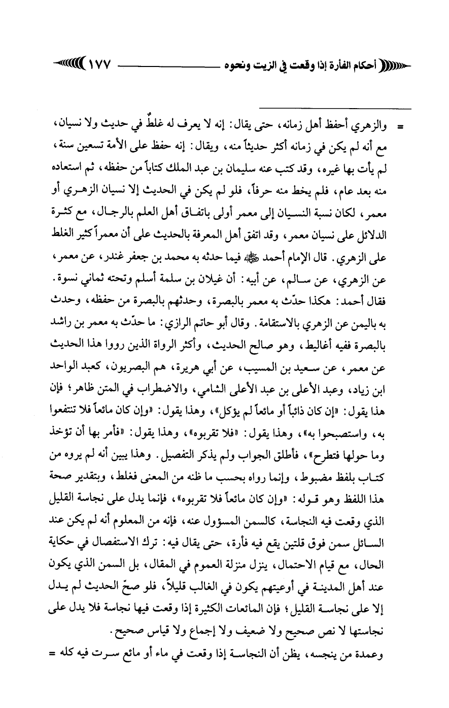 = والزهري أحفظ أهل زمانه، حتَّى يقال: إنه لا يعرف له غلط في حديث ولا نسيان، مع أنه لم يكن في زمانه أكثر حديثاً منه، ويقال: إنه حفظ على الأمة تسعين سنة، لم يأت بها غيره، وقد كتب عنه سليمان بن عبد الملك كتاباً من حفظه، ثم استعاده منه بعد عام، فلم يخط منه حرفاً، فلو لم يكن في الحديث إلَّا نسيان الزُّهريّ أو معمر، لكان نسبة النسيان إلى معمر أولى باتفاق أهل العلم بالرجال، مع كثرة الدلائل على نسيان معمر، وقد اتفق أهل المعرفة بالحديث على أن معمراً كثير الغلط على الزُّهريّ. قال الإمام أحمد - رضي الله عنه - فيما حديثه به محمد بن جعفر غندر، عن معمر، عن الزُّهريّ، عن سالم، عن أبيه: أن غيلان بن سلمة أسلم وتحته ثماني نسوة. فقال أحمد: هكذا حدّث به معمر بالبصرة، وحدثهم بالبصرة من حفظه، وحدث به باليمن عن الزُّهريّ بالاستقامة. وقال أبو حاتم الرازي: ما حدّث به معمر بن راشد بالبصرة ففيه أغاليط، وهو صالح الحديث، وأكثر الرواة الذين رووا هذا الحديث عن معمر، عن سعيد بن المسيب، عن أبي هريرة، هم البصريون، كعبد الواحد ابن زياد، وعبد الأعلى بن عبد الأعلى الشَّاميُّ، والاضطراب في المتن ظاهر؛ فإن هذا يقول: "إن كان ذائباً أو مائعاً لم يؤكل"، وهذا يقول: "وإن كان مائعاً فلا تنتفعوا به، واستصبحوا به"، وهذا يقول: "فلا تقربوه"، وهذا يقول: "فأمر بها أن تؤخذ وما حولها فتطرح"، فأطلق الجواب ولم يذكر التفصيل. وهذا يبين أنه لم يروه من كتاب بلفظ مضبوط، وإنما رواه بحسب ما ظنه من المعنى فغلط، وبتقدير صحة هذا اللفظ وهو قوله: "وإن كان مائعاً فلا تقربوه"، فإنما يدل على نجاسة القليل الذي وقعت فيه النجاسة، كالسمن المسؤول عنه، فإنّه من المعلوم أنه لم يكن عند السائل سمن فوق قلتين يقع فيه فأرة، حتَّى يقال فيه: ترك الاستفصال في حكاية الحال، مع قيام الاحتمال، ينزل منزلة العموم في المقال، بل السمن الذي يكون عند أهل المدينة في أوعيتهم يكون في الغالب قليلاً، فلو صحّ الحديث لم يدل إلَّا على نجاسة القليل؛ فإن المائعات الكثيرة إذا وقعت فيها نجاسة فلا يدل على نجاستها لا نص صحيح ولا ضعيف ولا إجماع ولا قياس صحيح.