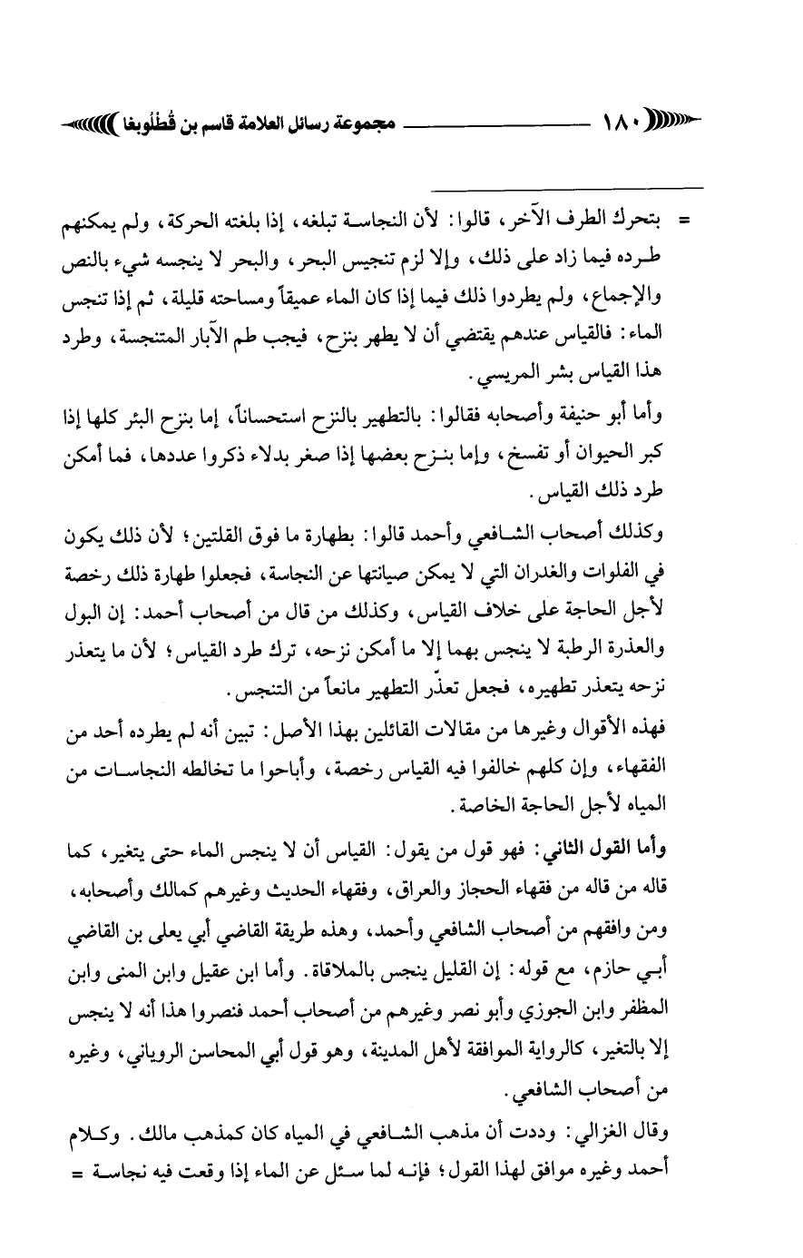 وقال الغزالي: وددت أن مذهب الشافعي في المياه كان كمذهب مالك. وكلام أحمد وغيره موافق لهذا القول؛ فإنّه لما سئل عن الماء إذا وقعت فيه نجاسة =