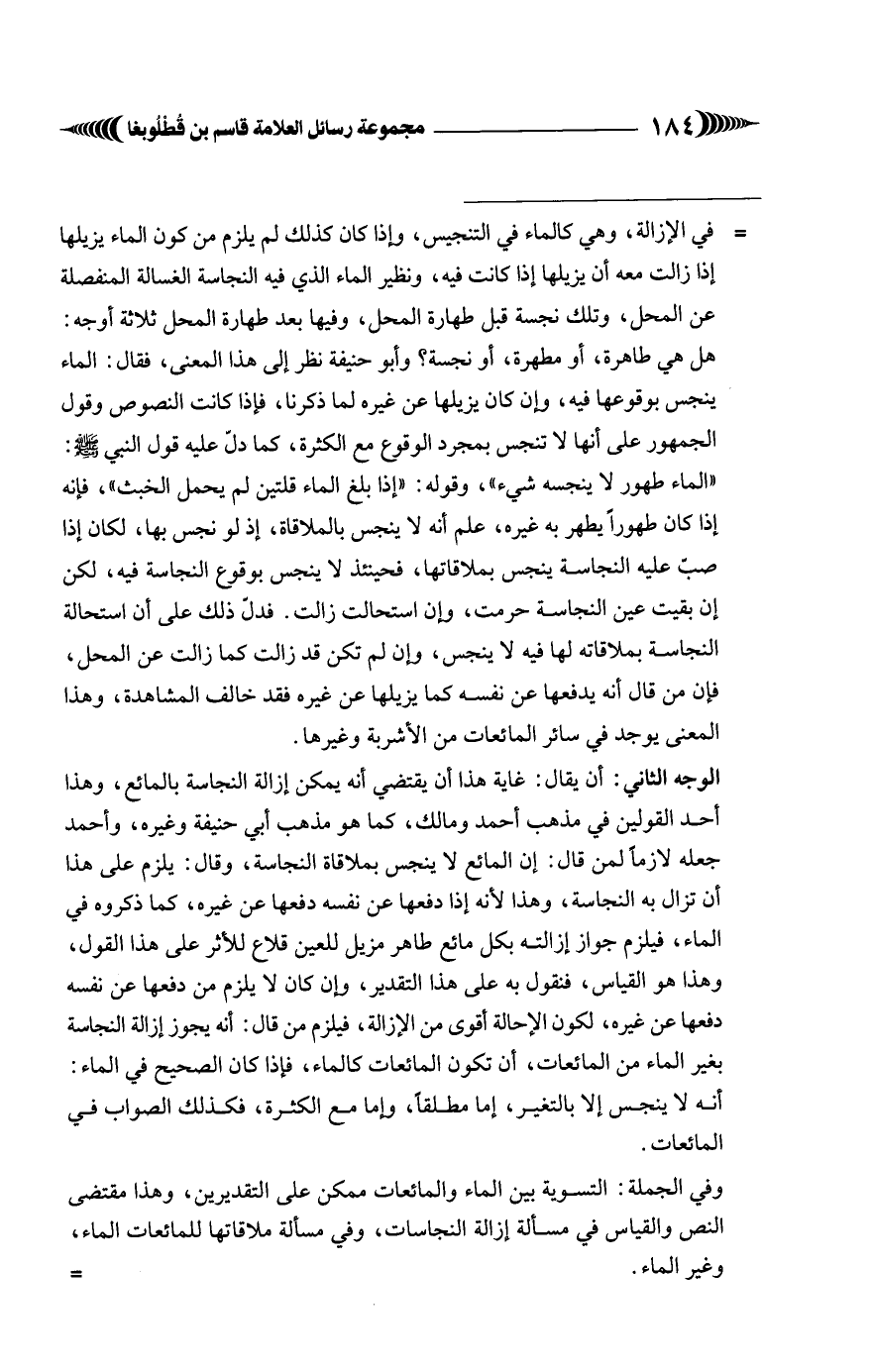 وفي الجملة: التسوية بين الماء والمائعات ممكن على التقديرين، وهذا مقتضى النص والقياس في مسألة إزالة النجاسات، وفي مسألة ملاقاتها للمائعات الماء، وغير الماء. =