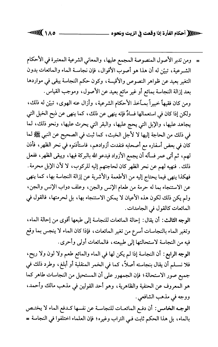 ومن كان فقيهاً خبيراً بمآخذ الأحكام الشرعية، وأزال عنه الهوى، تبيّن له ذلك، ولكن إذا كان في استعمالها فسادٌ فإنّه ينهى عن ذلك، كما ينهى عن ذبح الخيل التي يجاهد عليها، والإبل التي يحج عليها، والبقر التي يحرث عليها، ونحو ذلك، لما في ذلك من الحاجة إليها لا لأجل الخبث، كما ثبت في الصحيح عن النبي - صَلَّى الله عليه وسلم - لما كان في بعض أسفاره مع أصحابه فنفدت أزوادهم، فاستأذنوه في نحر الظهر، فأذن لهم، ثم أتى عمر فسأله أن يجمع الأزواد فيدعو الله بالبركة فيها، ويبقى الظهر، ففعل ذلك. فنهيه لهم عن نحر الظهر كان لحاجتهم إليه للركوب، لا لأن الإبل محرمة. فهكذا ينهى فيما يحتاج إليه من الأطعمة والأشربة عن إزالة النجاسة بها، كما ينهى عن الاستنجاء بما له حرمة من طعام الإنس والجن، وعلف دواب الإنس والجن، ولم يكن ذلك لكون هذه الأعيان لا يمكن الاستنجاء بها، بل لحرمتها، فالقول في المائعات كالقول في الجامدات.