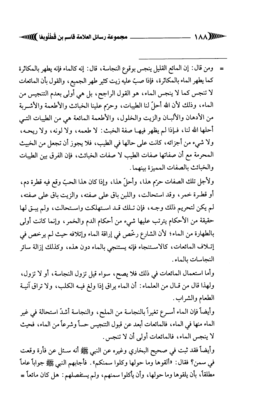 = ومن قال: إن المائع القليل ينجس بوقوع النجاسة، قال: إنه كالماء فإنّه يطهر بالمكاثرة كما يطهر الماء بالمكاثرة، فإذا صبّ عليه زيت كثير طهر الجميع، والقول بأن المائعات لا تنجس كما لا ينجس الماء، هو القول الراجح، بل هي أولى بعدم التنجيس من الماء، وذلك لأنَّ الله أحل لنا الطيبات، وحرّم علينا الخبائث والأطعمة والأشربة من الأدهان والألبان والزيت والخلول، والأطعمة المائعة هي من الطيبات التي أحلها الله لنا، فإذا لم يظهر فيها صفة الخبث: لا طعمه، ولا لونه، ولا ريحه، ولا شيء من أجزائه، كانت على حالها في الطيب، فلا يجوز أن تجعل من الخبيث المحرمة مع أن صفاتها صفات الطيب لا صفات الخبائث، فإن الفرق بين الطيبات والخبائث بالصفات المميزة بينهما.