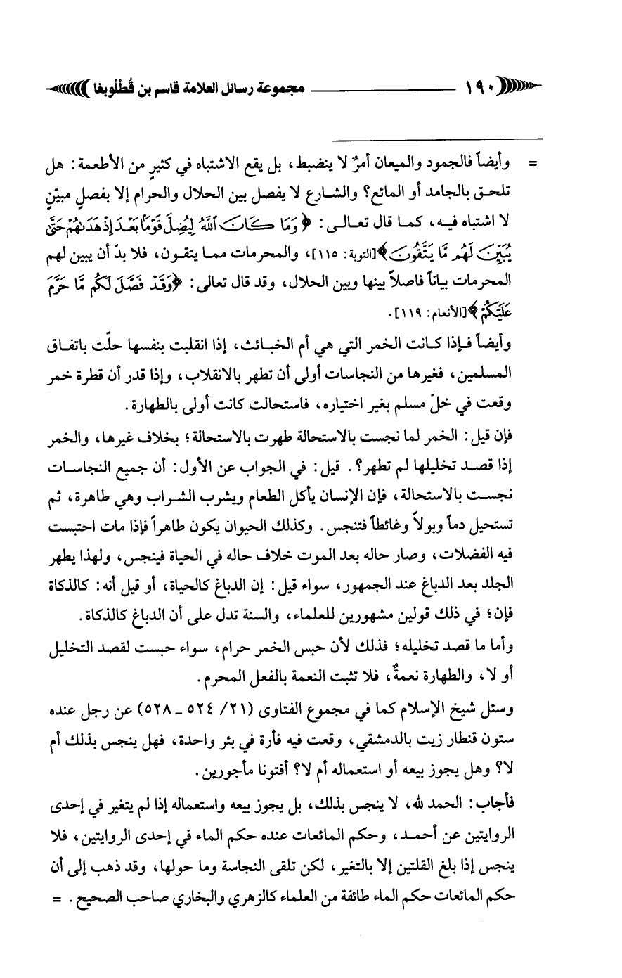 وأيضًا فإذا كانت الخمر التي هي أم الخبائث، إذا انقلبت بنفسها حلّت باتفاق المسلمين، فغيرها من النجاسات أولى أن تطهر بالانقلاب، وإذا قدر أن قطرة خمر وقعت في خلّ مسلم بغير اختياره، فاستحالت كانت أولى بالطهارة.