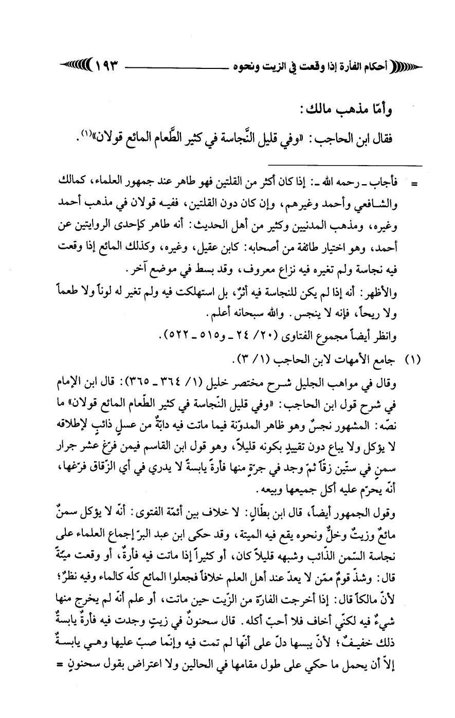 وقال في مواهب الجليل شرح مختصر خليل (1/ 364 - 365): قال ابن الإمام في شرح قول ابن الحاجب: "وفي قليل النّجاسة في كثير الطعام المائع قولان" ما نصُّه: المشهور نجسٌ وهو ظاهر المدوّنة فيما ماتت فيه دابهٌ من عسلٍ ذائبٍ لإطلاقه لا يؤكل ولا يباع دون تقييدٍ بكونه قليلاً، وهو قول ابن القاسم فيمن فرّغ عشر جرار سمنٍ في ستين زقًّا ثمّ وجد في جرّةٍ منها فأرةً يابسةً لا يدري في أي الزّقاق فرّغها، أنَّهُ يحرّم عليه أكل جميعها وبيعه.