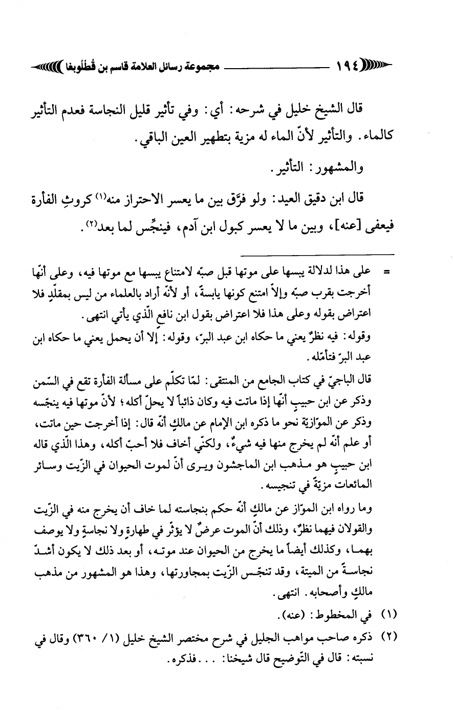 (¬2) ذكره صاحب مواهب الجليل في شرح مختصر الشيخ خليل (1/ 360) وقال في نسبته: قال في التوضيح قال شيخنا:. . . فذكره.