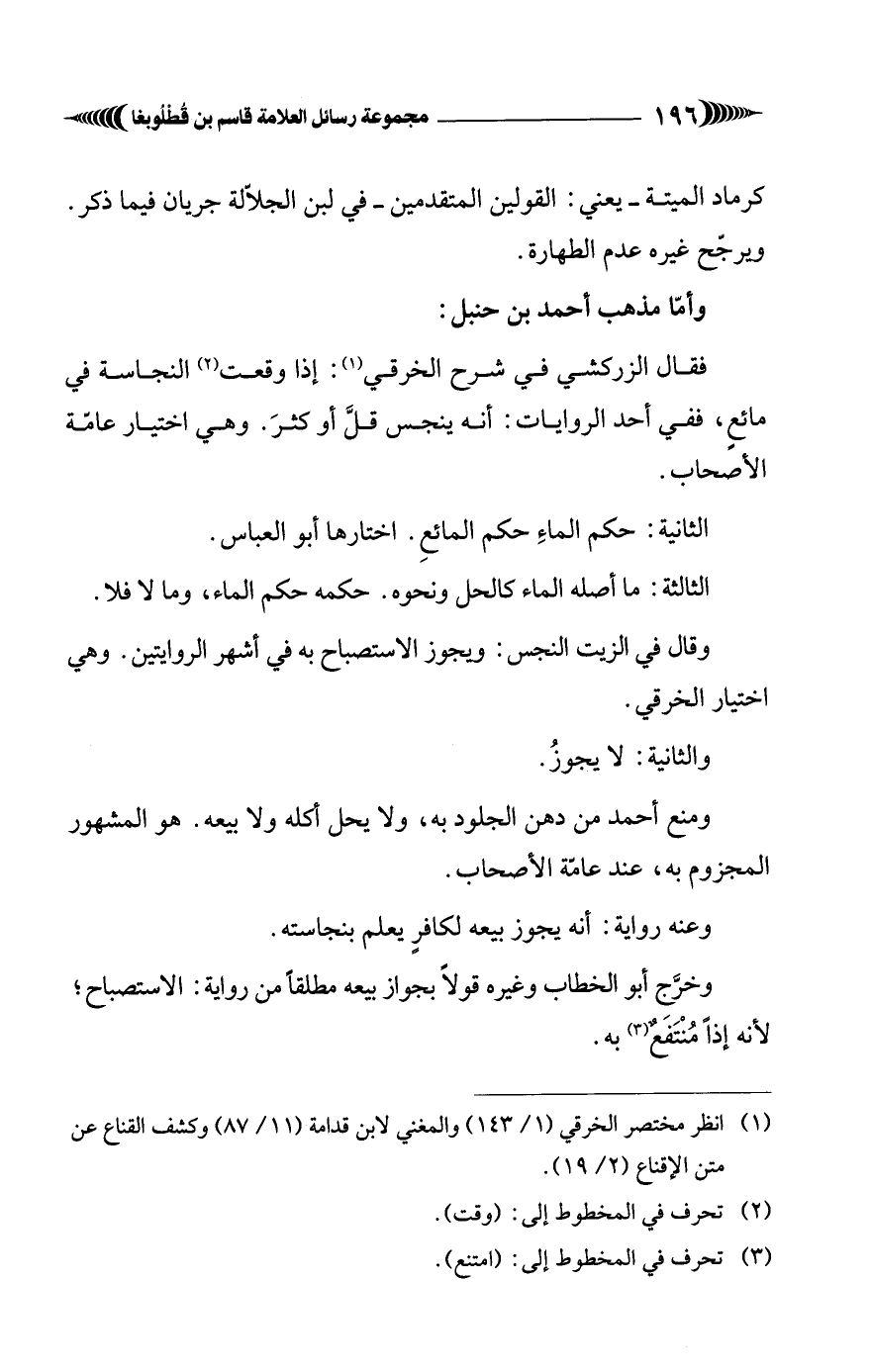 وقال في الزيت النجس: ويجوز الاستصباح به في أشهر الروايتين. وهي اختيار الخرقي.