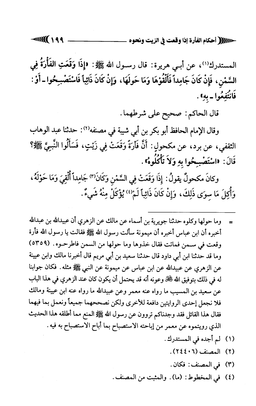 المستدرك (¬1)، عن أبي هريرة: قال رسول الله - صَلَّى الله عليه وسلم -: "إِذَا وَقَعَتِ الفَأرَةُ فِي السَّمْنِ، فَإِنْ كَانَ جَامِداً فَألْقُوْهَا وَمَا حَولَهَا، وَإنْ كَانَ ذَائِباً فَاسْتَصْبِحُوا - أَوْ: فَانتفِعُوا - بِهِ".