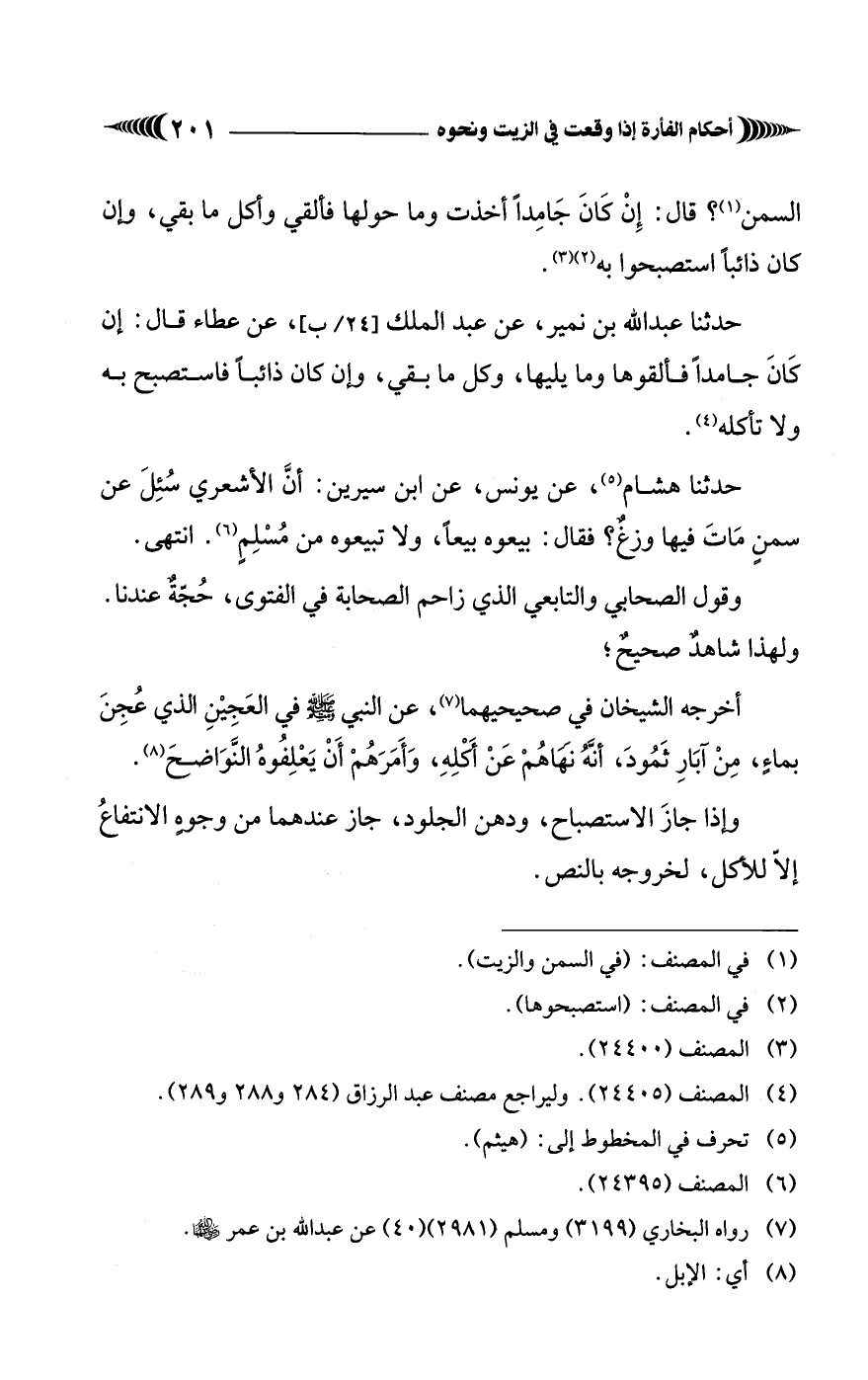 حدثنا عبد الله بن نمير، عن عبد الملك [24/ ب] عن عطاء قال: إن كَانَ جامدًا فألقوها وما يليها، وكل ما بقي، وإن كان ذائبًا فاستصبح به ولا تأكله (¬4).