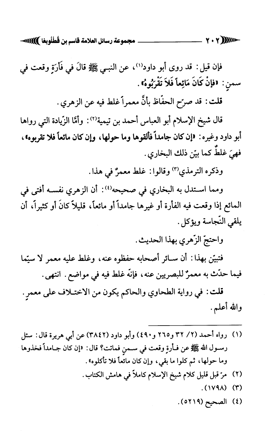 قال شيخ الإسلام أبو العباس أحمد بن تيمية (¬2): وأمَّا الزيادة التي رواها أبو داود وغيره: "إن كان جامدًا فألقوها وما حولها، وان كان مائعًا فلا تقربوه"، فهيَ غلطٌ كما بيّن ذلك البخاري.