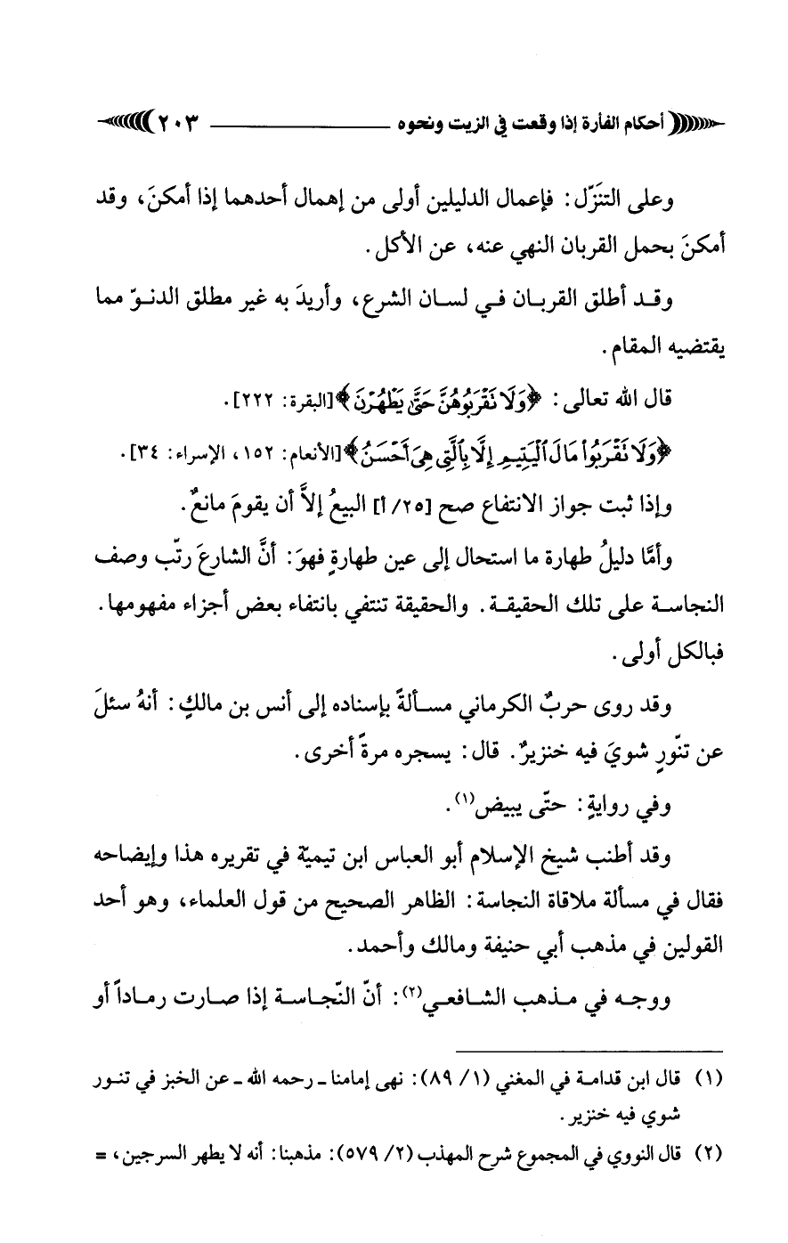 وقد أطنب شيخ الإسلام أبو العباس ابن تيميّة في تقريره هذا وإيضاحه فقال في مسألة ملاقاة النجاسة: الظاهر الصحيح من قول العلماء، وهو أحد القولين في مذهب أبي حنيفة ومالك وأحمد.